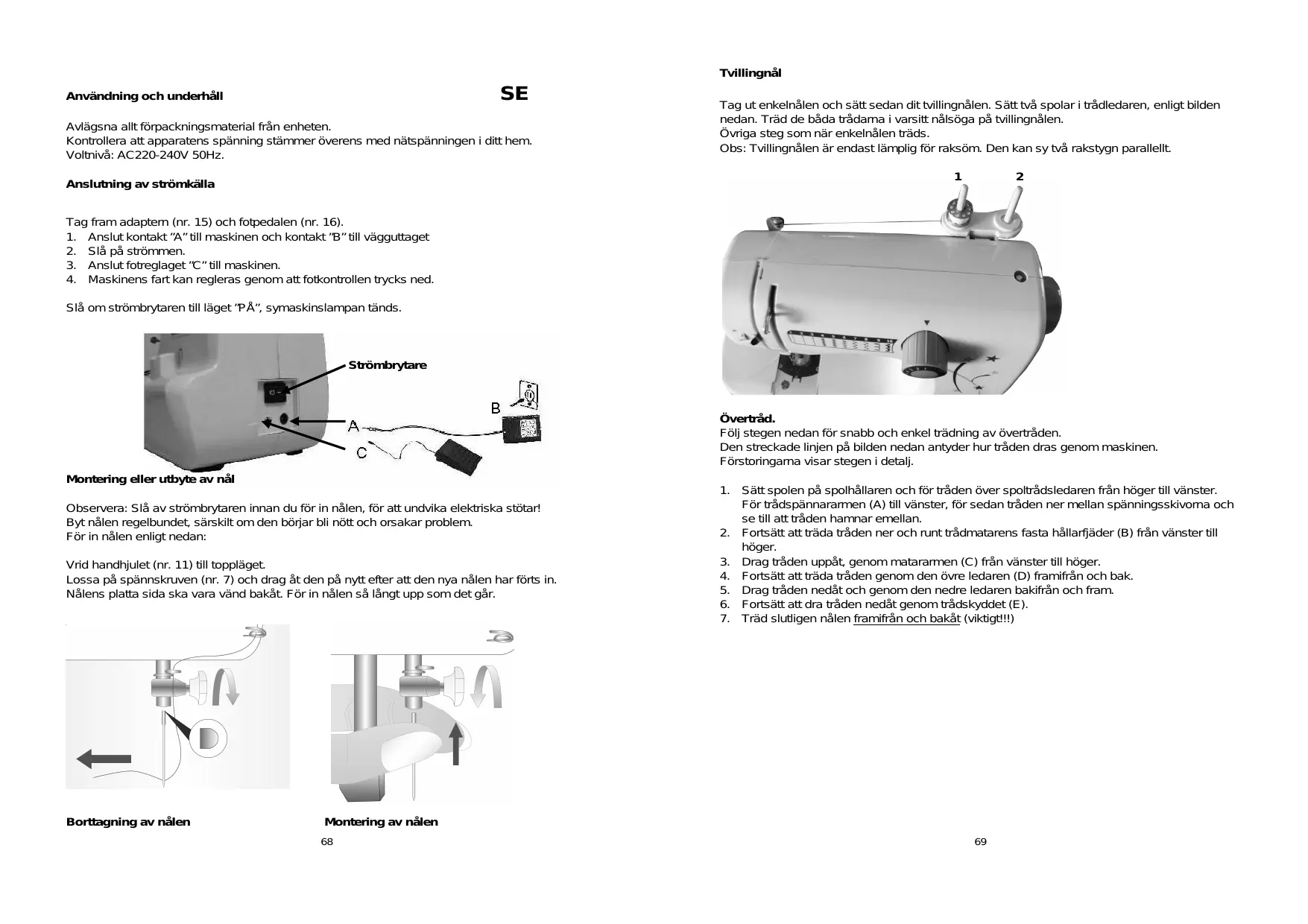 Tag fram adaptern (nr. 15) och fotpedalen (nr. 16). 1. Anslut kontakt ”A” till maskinen och kontakt ”B” till vägguttaget 2. Slå på strömmen. 3. Anslut fotreglaget ”C” till maskinen. 4. Maskinens fart kan regleras genom att fotkontrollen trycks ned. Slå om strömbrytaren till läget ”PÅ”, symaskinslampan tänds.