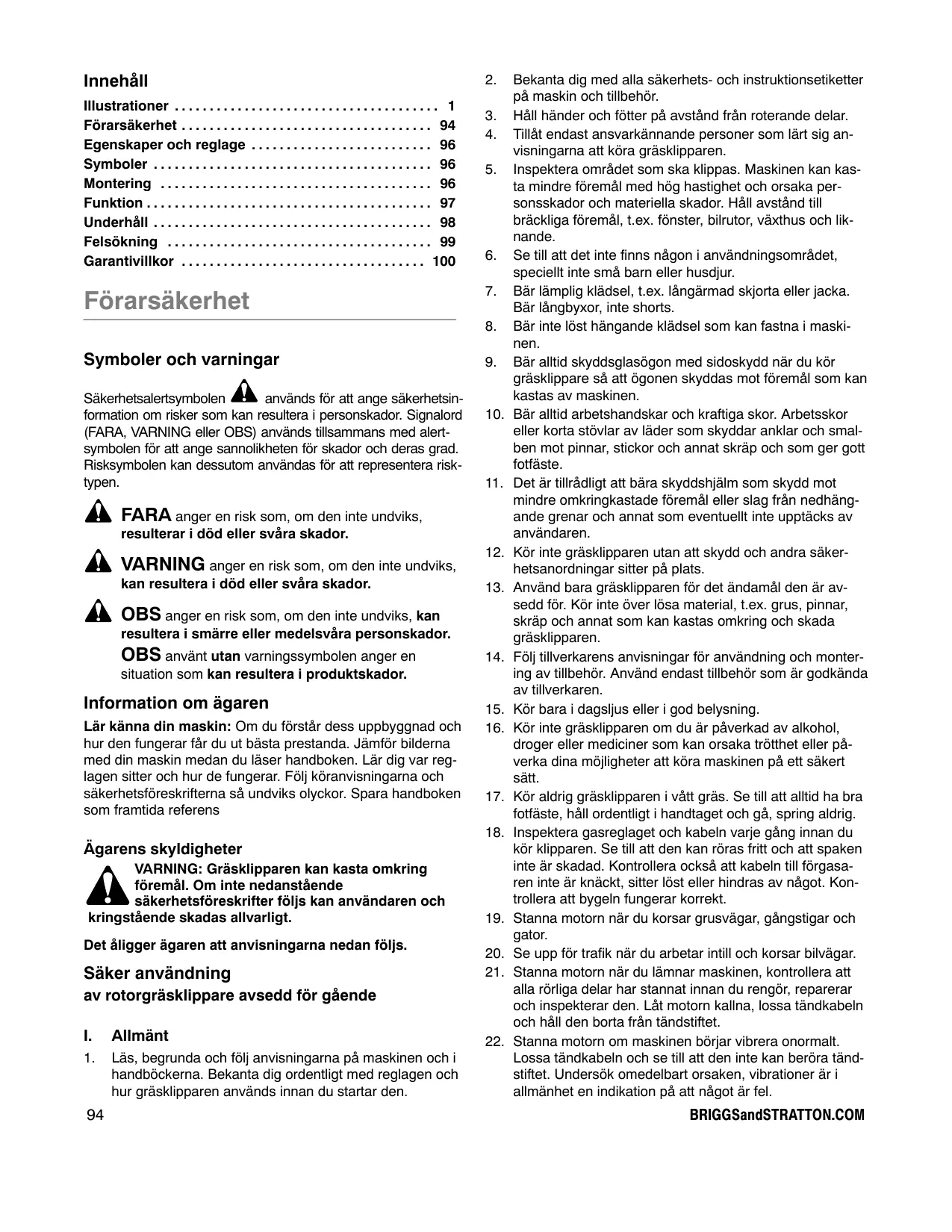 Prendre connaissance de toutes les étiquettes de sécurité et de fonctionnement présentes sur la machine, les équipements et les accessoires. Ne pas mettre les mains ou les pieds à proximité ou sous les parties tournantes. Ne confier l’utilisation de la tondeuse qu’à des personnes responsables, familiarisées avec les instructions. Inspecter la zone où la tondeuse sera utilisée. Celle-ci peut projeter à haute vitesse des petits objets pouvant provoquer des blessures ou des dégâts. Ne pas l’utiliser à proximité d’objets susceptibles de se casser tels que fenêtres, vitres de voiture, serres, etc. Ne laisser personne approcher de la zone de fonctionnement, en particulier les enfants et les animaux domestiques. Porter des vêtements appropriés comme une chemise à manches longues ou une veste. Porter aussi des pantalons ou salopettes. Ne pas porter de shorts. Ne pas porter de vêtements amples qui risqueraient de se prendre dans l’équipement. Toujours porter des lunettes de sécurité avec œillères de protection pendant l’utilisation de la tondeuse à conducteur marchant pour se protéger les yeux d’objets qui pourraient être projetés par la tondeuse Porter toujours des gants et des chaussures de travail. Des chaussures de travail ou des bottines en cuir sont appropriées pour pratiquement tout le monde. Elles protègent les chevilles et les tibias des petites branches, des échardes et autres débris et améliorent la mobilité. Il est recommandé de se munir d’une protection de la tête pour éviter le risque d’être touché par de petites particules volantes ou par des branches basses, brindilles ou autres objets que l’opérateur n’aurait pas remarqué. Ne jamais faire fonctionner la tondeuse à conducteur marchant sans ses protections, plaques ou autres dispositifs de sécurité. N’utiliser cet équipement que dans le cadre de son utilisation prévue. Ne pas faire passer la tondeuse sur des matériaux non fixés comme du gravier, des brindilles, des ordures, etc., qui présentent un risque de projection et d’endommagement de la tondeuse. Voir les instructions du fabricant pour l’installation et l’utilisation des accessoires. N’utiliser que des accessoires approuvés par le fabricant. N’utiliser qu’à la lumière du jour ou sous un éclairage artificiel suffisant. Ne pas faire fonctionner la tondeuse à conducteur marchant sous l’influence de l’alcool, de drogues ou de médicaments qui peuvent provoquer une somnolence ou affecter la capacité à l’utiliser. Ne pas utiliser la tondeuse à conducteur marchant avec de l’herbe humide. Avoir toujours le pied ferme, bien tenir la poignée et marcher, ne jamais courir. Avant chaque utilisation, inspecter le levier et le câble de la commande d’accélérateur. S’assurer que le câble n’est pas coincé et que le levier n’est pas endommagé. Vérifier aussi que les biellettes entre le câble et le carburateur ne sont pas tordues, n’ont pas perdu d’écrou et pivotent librement. Vérifier que le levier de commande fonctionne normalement. Couper le moteur pour traverser des allées, des passages ou des routes en gravier.