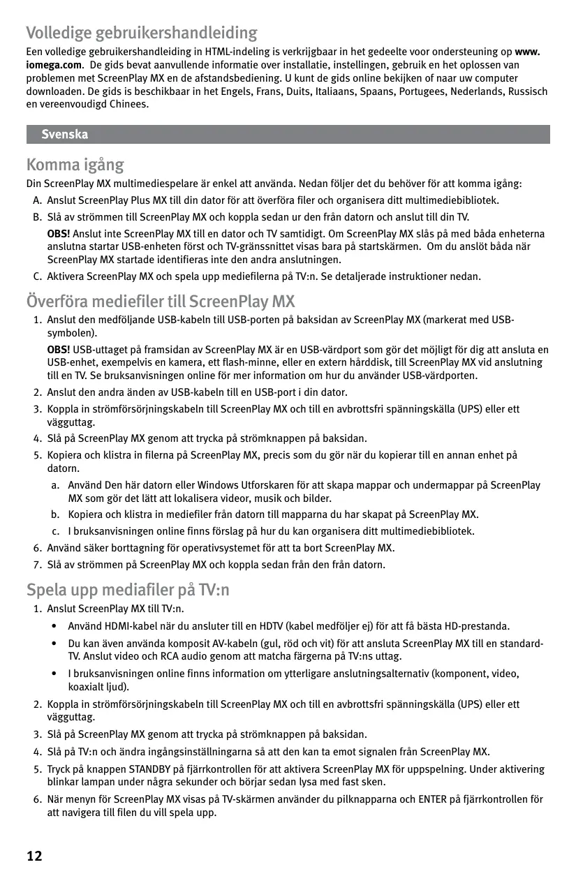 Volledige gebruikershandleiding Een volledige gebruikershandleiding in HTML-indeling is verkrijgbaar in het gedeelte voor ondersteuning op www. iomega.com. De gids bevat aanvullende informatie over installatie, instellingen, gebruik en het oplossen van problemen met ScreenPlay MX en de afstandsbediening. U kunt de gids online bekijken of naar uw computer downloaden. De gids is beschikbaar in het Engels, Frans, Duits, Italiaans, Spaans, Portugees, Nederlands, Russisch en vereenvoudigd Chinees. Komma igång Din ScreenPlay MX multimediespelare är enkel att använda. Nedan följer det du behöver för att komma igång: A. Anslut ScreenPlay Plus MX till din dator för att överföra filer och organisera ditt multimediebibliotek. B. Slå av strömmen till ScreenPlay MX och koppla sedan ur den från datorn och anslut till din TV. OBS! Anslut inte ScreenPlay MX till en dator och TV samtidigt. Om ScreenPlay MX slås på med båda enheterna anslutna startar USB-enheten först och TV-gränssnittet visas bara på startskärmen. Om du anslöt båda när ScreenPlay MX startade identifieras inte den andra anslutningen. C. Aktivera ScreenPlay MX och spela upp mediefilerna på TV:n. Se detaljerade instruktioner nedan. Överföra mediefiler till ScreenPlay MX