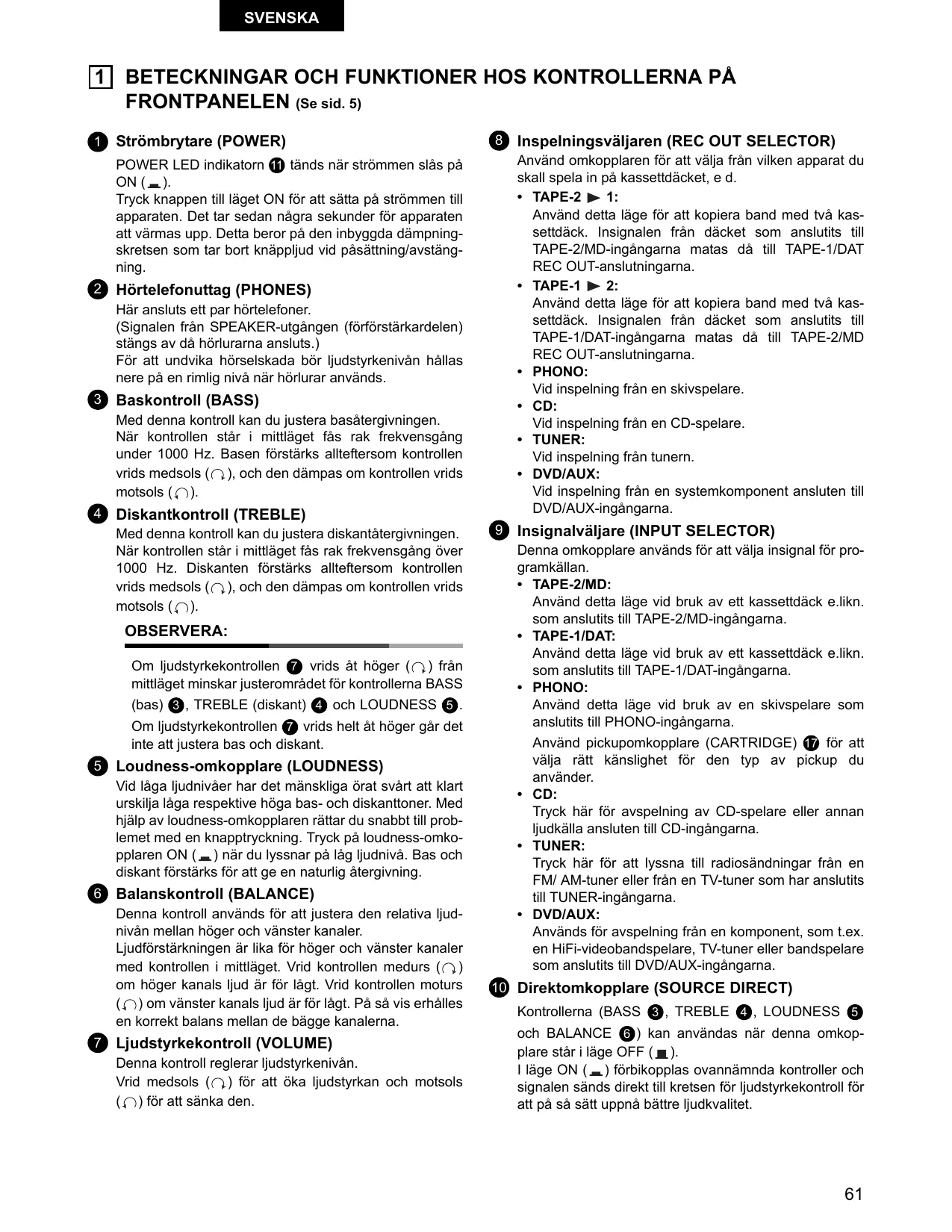 Direktomkopplare (SOURCE DIRECT) Kontrollerna (BASS @, TREBLE @, LOUDNESS @