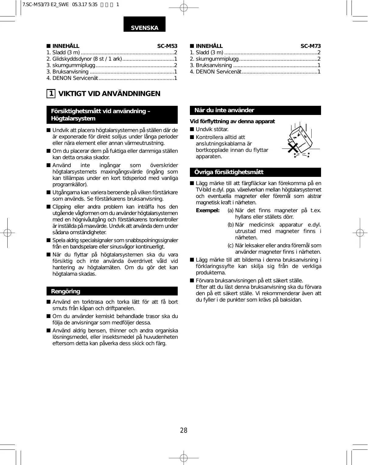 Téléchargez la notice de votre Högtalare au format PDF gratuitement ! Retrouvez votre notice S-M53 - DENON et reprennez votre appareil électronique en main. Sur cette page sont publiés tous les documents nécessaires à l'utilisation de votre appareil S-M53 de la marque DENON.