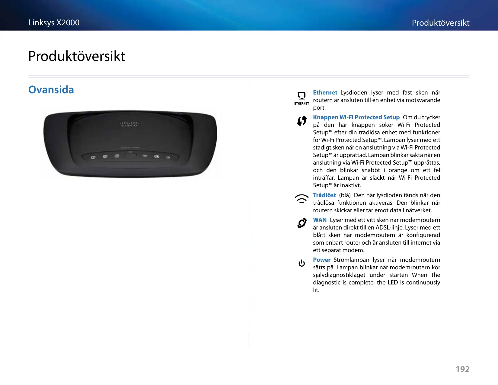 Ethernet Lysdioden lyser med fast sken när routern är ansluten till en enhet via motsvarande port. Knappen Wi-Fi Protected Setup Om du trycker på den här knappen söker Wi-Fi Protected Setup™ efter din trådlösa enhet med funktioner för Wi-Fi Protected Setup™. Lampan lyser med ett stadigt sken när en anslutning via Wi-Fi Protected Setup™ är upprättad. Lampan blinkar sakta när en anslutning via Wi-Fi Protected Setup™ upprättas, och den blinkar snabbt i orange om ett fel inträffar. Lampan är släckt när Wi-Fi Protected Setup™ är inaktivt. Trådlöst (blå) Den här lysdioden tänds när den trådlösa funktionen aktiveras. Den blinkar när routern skickar eller tar emot data i nätverket. WAN Lyser med ett vitt sken när modemroutern är ansluten direkt till en ADSL-linje. Lyser med ett blått sken när modemroutern är konfigurerad som enbart router och är ansluten till internet via ett separat modem. Power Strömlampan lyser när modemroutern sätts på. Lampan blinkar när modemroutern kör självdiagnostikläget under starten When the diagnostic is complete, the LED is continuously lit.
