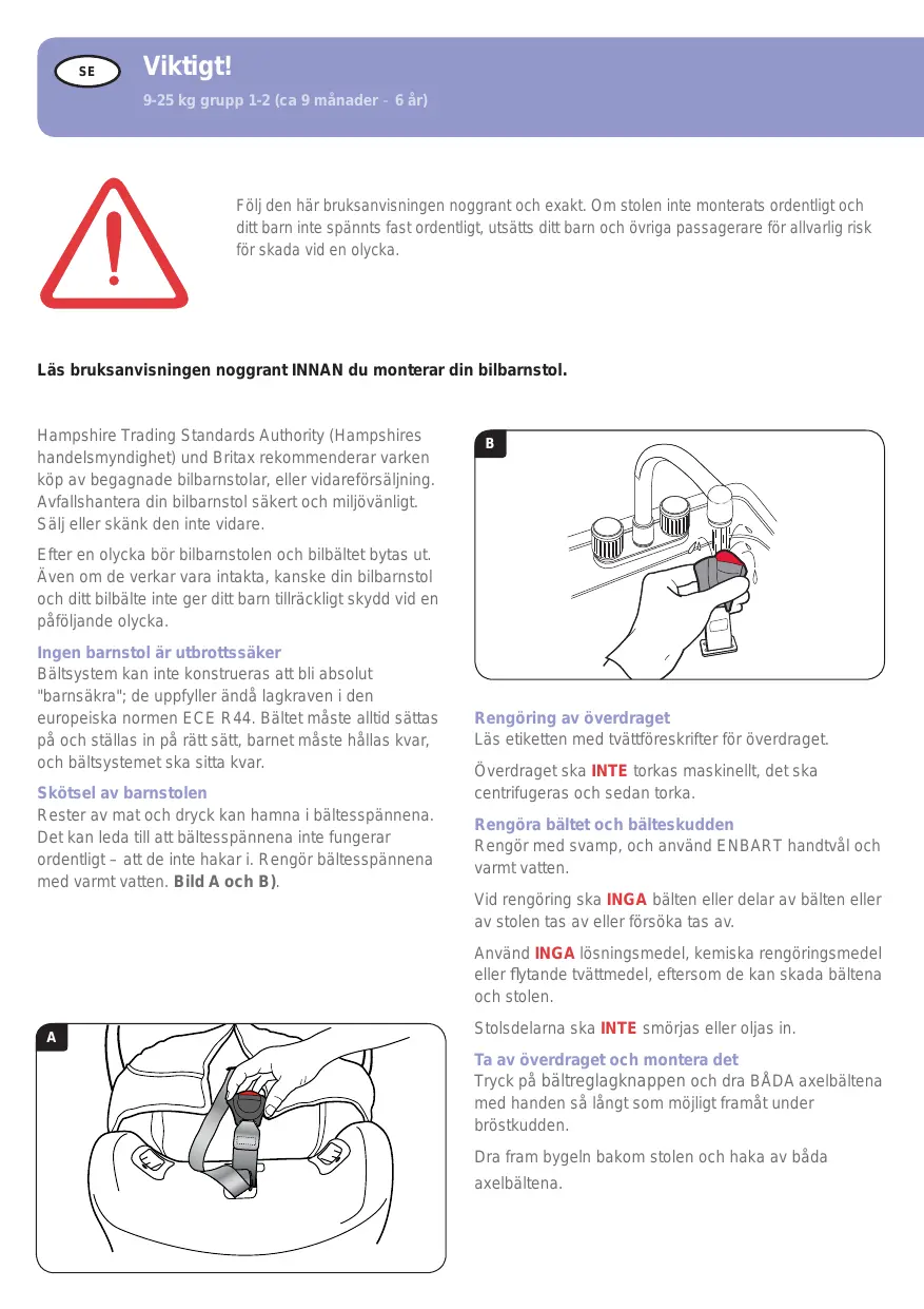 Rengöring av överdraget Läs etiketten med tvättföreskrifter för överdraget. Överdraget ska INTE torkas maskinellt, det ska centrifugeras och sedan torka. Rengöra bältet och bälteskudden Rengör med svamp, och använd ENBART handtvål och varmt vatten. Vid rengöring ska INGA bälten eller delar av bälten eller av stolen tas av eller försöka tas av. Använd INGA lösningsmedel, kemiska rengöringsmedel eller flytande tvättmedel, eftersom de kan skada bältena och stolen.