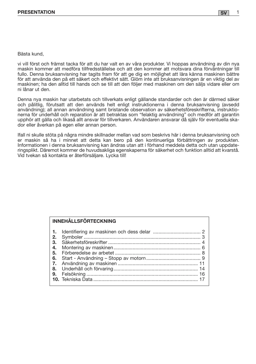 vi vill Först och främst tacka für att du har valt en av väraprodukter. Vi hoppas använding av din nya maskinkommen att medföra tillfredsstellelse och att denkommen att motsvara dina forväntingar till fullo. Denna brauksanvising har tagits fram for att ge dig en möjligheit att lara kànnaskinen bättre for att använda den på att säkert och effektiv satt. Glöm inte att brauksanvisingen ar en viktig del av maskinen; ha den alltid till hands och se till att den foljer med maskinen om den saljs vidare erer om ni lánar ut den.