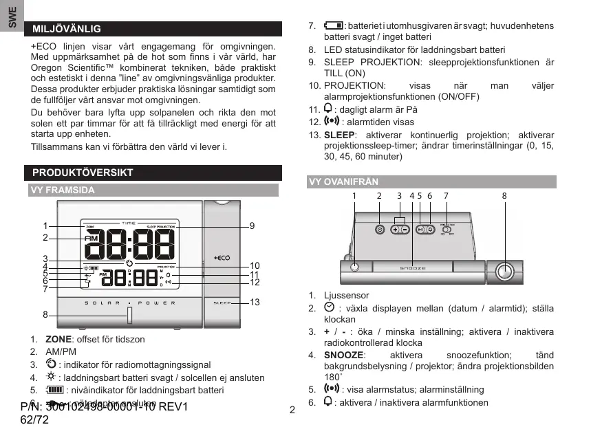+ECO linjen visar vårt engagemang för omgivningen. Med uppmärksamhet på de hot som finns i vår värld, har Oregon Scientific™ kombinerat tekniken, både praktiskt och estetiskt i denna ”line” av omgivningsvänliga produkter. Dessa produkter erbjuder praktiska lösningar samtidigt som de fullföljer vårt ansvar mot omgivningen. Du behöver bara lyfta upp solpanelen och rikta den mot solen ett par timmar för att få tillräckligt med energi för att starta upp enheten. Tillsammans kan vi förbättra den värld vi lever i.