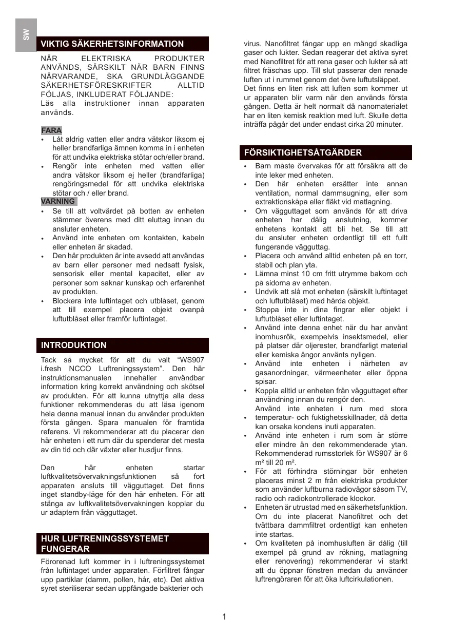 INTRODUKTION Tack så mycket för att du valt “WS907 i.fresh NCCO Luftreningssystem”. Den här instruktionsmanualen innehåller användbar information kring korrekt användning och skötsel av produkten. För att kunna utnyttja alla dess funktioner rekommenderas du att läsa igenom hela denna manual innan du använder produkten första gången. Spara manualen för framtida referens. Vi rekommenderar att du placerar den här enheten i ett rum där du spenderar det mesta av din tid och där växter eller husdjur finns.