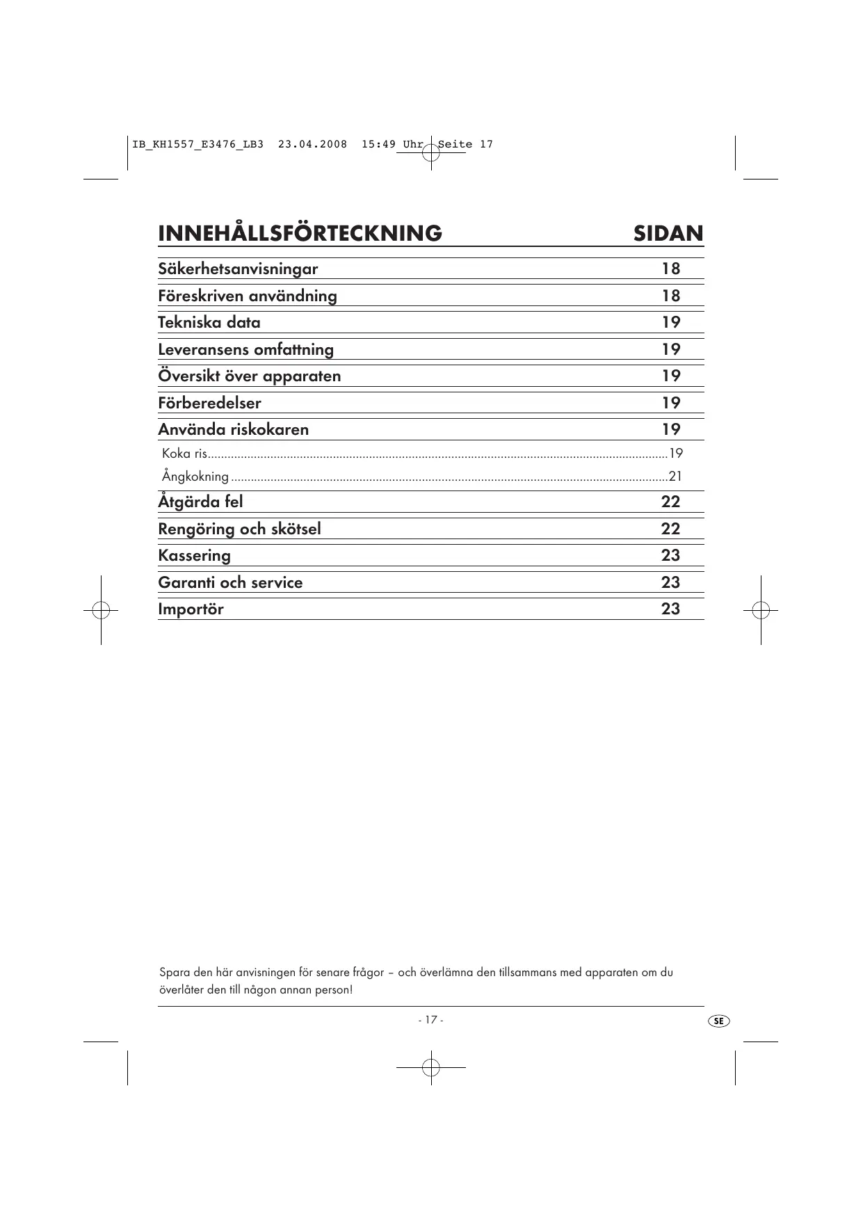 Spara den har anvisingen for senare fragor - och overlamna den tillsammans med apparaten om du overlater den till nagon annan person!