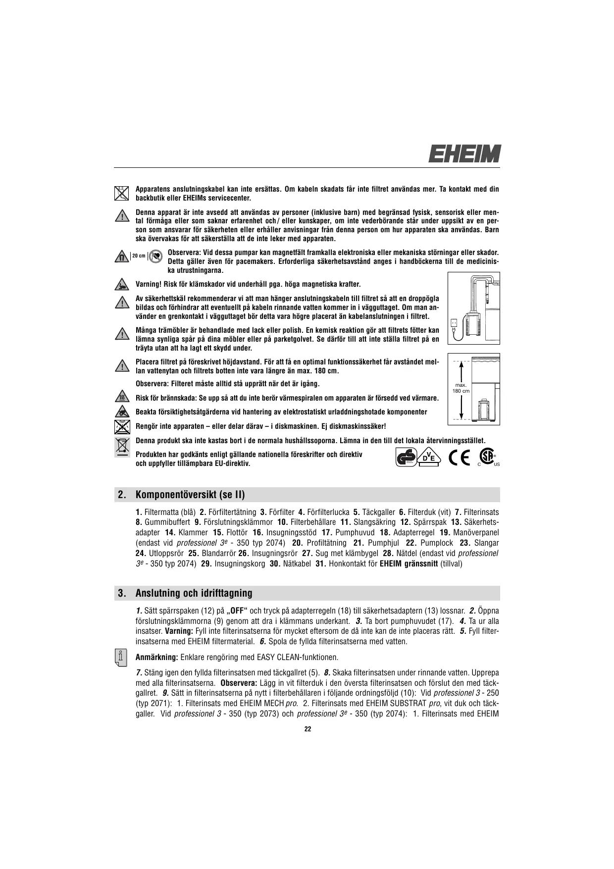 Apparatens anslutningskabel kan inte ersättas. Om kabeln skadats får inte filtret användas mer. Ta kontakt med din backbutik eller EHEIMs servicecenter. Denna apparat är inte avsedd att användas av personer (inklusive barn) med begränsad fysisk, sensorisk eller mental förmåga eller som saknar erfarenhet och / eller kunskaper, om inte vederbörande står under uppsikt av en person som ansvarar för säkerheten eller erhåller anvisningar från denna person om hur apparaten ska användas. Barn ska övervakas för att säkerställa att de inte leker med apparaten. 20 cm Observera: Vid dessa pumpar kan magnetfält framkalla elektroniska eller mekaniska störningar eller skador. Detta gäller även för pacemakers. Erforderliga säkerhetsavstånd anges i handböckerna till de mediciniska utrustningarna. Varning! Risk för klämskador vid underhåll pga. höga magnetiska krafter. Av säkerhettskäl rekommenderar vi att man hänger anslutningskabeln till filtret så att en droppögla bildas och förhindrar att eventuellt på kabeln rinnande vatten kommer in i vägguttaget. Om man använder en grenkontakt i vägguttaget bör detta vara högre placerat än kabelanslutningen i filtret. Många trämöbler är behandlade med lack eller polish. En kemisk reaktion gör att filtrets fötter kan lämna synliga spår på dina möbler eller på parketgolvet. Se därför till att inte ställa filtret på en träyta utan att ha lagt ett skydd under. Placera filtret på föreskrivet höjdavstand. För att få en optimal funktionssäkerhet får avståndet mellan vattenytan och filtrets botten inte vara längre än max. 180 cm. Observera: Filteret måste alltid stå upprätt när det är igång. max. 180 cm Risk för brännskada: Se upp så att du inte berör värmespiralen om apparaten är försedd ved värmare. Beakta försiktighetsåtgärderna vid hantering av elektrostatiskt urladdningshotade komponenter Rengör inte apparaten – eller delar därav – i diskmaskinen. Ej diskmaskinssäker! Denna produkt ska inte kastas bort i de normala hushållssoporna. Lämna in den till det lokala återvinningsstället. Produkten har godkänts enligt gällande nationella föreskrifter och direktiv och uppfyller tillämpbara EU-direktiv. geprüfte Sicherheit