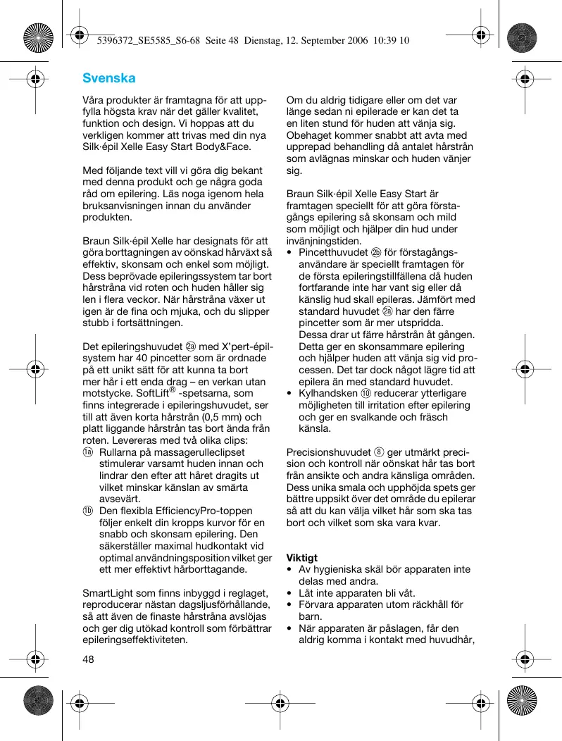 SmartLight som finns inbyggd i reglaget, reproducerar nästan dagsljusférhällande, sà att även de finaste härsträna avsljas och ger dig utékad kontroll som férbättrar epileringseffektiviteten. ; 12. September 2006 10:39 10 +1@ Om du aldrig tidigare eller om det var länge sedan ni epilerade er kan det ta en liten stund fôr huden att vänja sig. Obehaget kommer snabbt att avta med upprepad behandling dà antalet härsträn som avlägnas minskar och huden vänjer sig. Braun Silk-épil Xelle Easy Start är framtagen speciell für att gôra fôrsta- gângs epilering sà skonsam och mild som môjlgt och hjälper din hud under inväniningstiden. + Pincetthuvudet & fôr férstagängs- användare är speciellt framtagen fôr de férsta epileringstilfällena dà huden fortfarande inte har vant sig eller dà Känslig hud skall epileras. Jämfôrt med standard huvudet & har den färre pincetter som är mer utspridda. Dessa drar ut färre härsträn àt gângen. Detta ger en skonsammare epilering och hjälper huden att vänja sig vid pro- cessen. Det tar dock nägot lägre tid att epilera än med standard huvudet Kylhandsken @ reducerar ytteigare môjligheten till irrtation efter epilering och ger en svalkande och fräsch känsia. Precisionshuvudet ©) ger utmärkt preci- sion och kontrol när oônskat här tas bort frän ansikte och andra känsliga omräden. Dess unika smala och upphäjda spets ger bättre uppsikt ver det omrâde du epilerar sà att du kan välja vilket hr som ska tas bort och vilket som ska vara kvar. Viktigt AV hygieniska skäl bür apparaten inte delas med andra. Lät inte apparaten li vât. Fôrvara apparaten utom räckhäll fôr bar. När apparaten är pâslagen, fär den aldrig Komma i Kontakt med huvudhär, 48 (CO) 3 7 PS ® K@) er 4