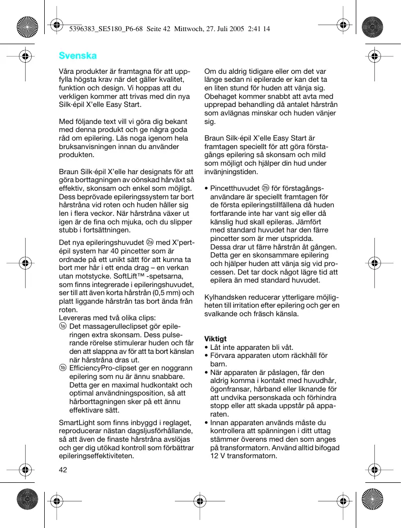 5396383_SE5180_P6-68 Seite 42 Mittwoch, 27. Juli 2005 2:41 14 Svenska Våra produkter är framtagna för att uppfylla högsta krav när det gäller kvalitet, funktion och design. Vi hoppas att du verkligen kommer att trivas med din nya Silk·épil X’elle Easy Start. Med följande text vill vi göra dig bekant med denna produkt och ge några goda råd om epilering. Läs noga igenom hela bruksanvisningen innan du använder produkten. Braun Silk·épil X’elle har designats för att göra borttagningen av oönskad hårväxt så effektiv, skonsam och enkel som möjligt. Dess beprövade epileringssystem tar bort hårstråna vid roten och huden håller sig len i flera veckor. När hårstråna växer ut igen är de fina och mjuka, och du slipper stubb i fortsättningen. Det nya epileringshuvudet B med X’pertépil system har 40 pincetter som är ordnade på ett unikt sätt för att kunna ta bort mer hår i ett enda drag – en verkan utan motstycke. SoftLift™ -spetsarna, som finns integrerade i epileringshuvudet, ser till att även korta hårstrån (0,5 mm) och platt liggande hårstrån tas bort ända från roten. Levereras med två olika clips: A Det massagerulleclipset gör epileringen extra skonsam. Dess pulserande rörelse stimulerar huden och får den att slappna av för att ta bort känslan när hårstråna dras ut. a EfficiencyPro-clipset ger en noggrann epilering som nu är ännu snabbare. Detta ger en maximal hudkontakt och optimal användningsposition, så att hårborttagningen sker på ett ännu effektivare sätt. SmartLight som finns inbyggd i reglaget, reproducerar nästan dagsljusförhållande, så att även de finaste hårstråna avslöjas och ger dig utökad kontroll som förbättrar epileringseffektiviteten.