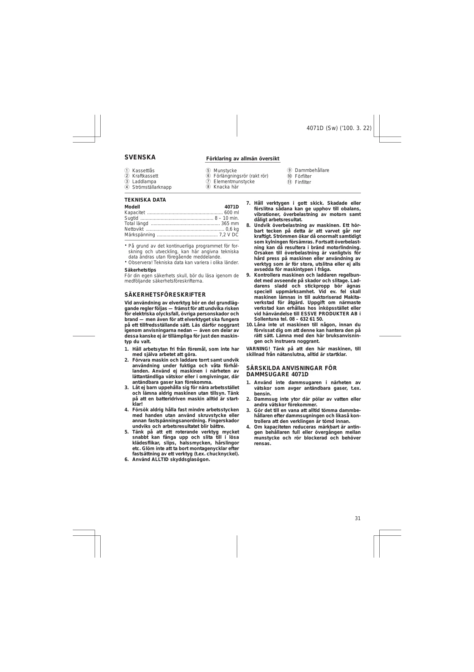 Téléchargez la notice de votre Sladdlös borrmaskin au format PDF gratuitement ! Retrouvez votre notice 4071D - MAKITA et reprennez votre appareil électronique en main. Sur cette page sont publiés tous les documents nécessaires à l'utilisation de votre appareil 4071D de la marque MAKITA.