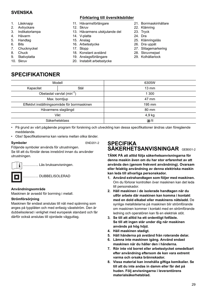 - Obs! Specifikationerna kan variera mellan olika länder. END201-2 Symboler Följande symboler används för utrustningen. Se till att du förstår deras innebörd innan du använder utrustningen. ................ Läs bruksanvisningen. ................ DUBBELISOLERAD Användningsområde Maskinen är avsedd för borrning i metall. Strömförsörjning Maskinen får endast anslutas till nät med spänning som anges på typplåten och med enfasig växelström. Den är dubbelisolerad i enlighet med europeisk standard och får därför också anslutas till ojordade vägguttag. SPECIFIKA SÄKERHETSANVISNINGAR GEB001-2 TÄNK PÅ att alltid följa säkerhetsanvisningarna för denna maskin även om du har stor erfarenhet av att använda den (genom frekvent användning). Ovarsam eller felaktig användning av denna elektriska maskin kan leda till allvarliga personskador.