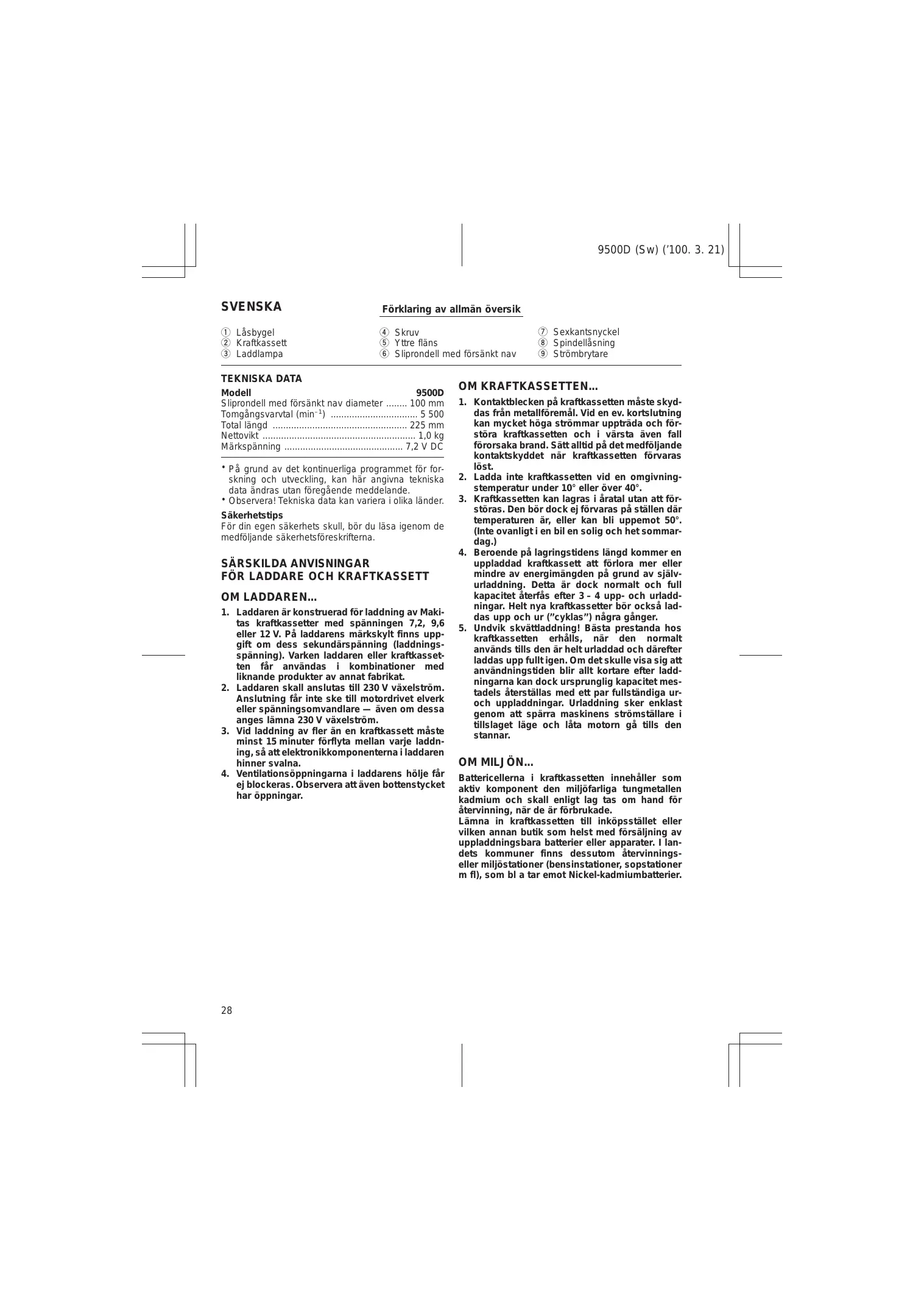 TEKNISKA DATA Modell 9500D Sliprondell med försänkt nav diameter 100 mm –1 Tomgångsvarvtal (min ) 5 500 Total längd 225 mm Nettovikt 1,0 kg Märkspänning 7,2 V DC • På grund av det kontinuerliga programmet för forskning och utveckling, kan här angivna tekniska data ändras utan föregående meddelande. • Observera! Tekniska data kan variera i olika länder. Säkerhetstips För din egen säkerhets skull, bör du läsa igenom de medföljande säkerhetsföreskrifterna.