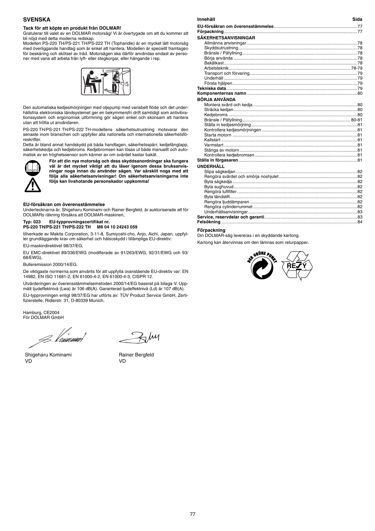 Les signataires, Shigeharu Kominami et Rainer Bergfeld, tels qu'autorisés, déclarent que les appareils DOLMAR,