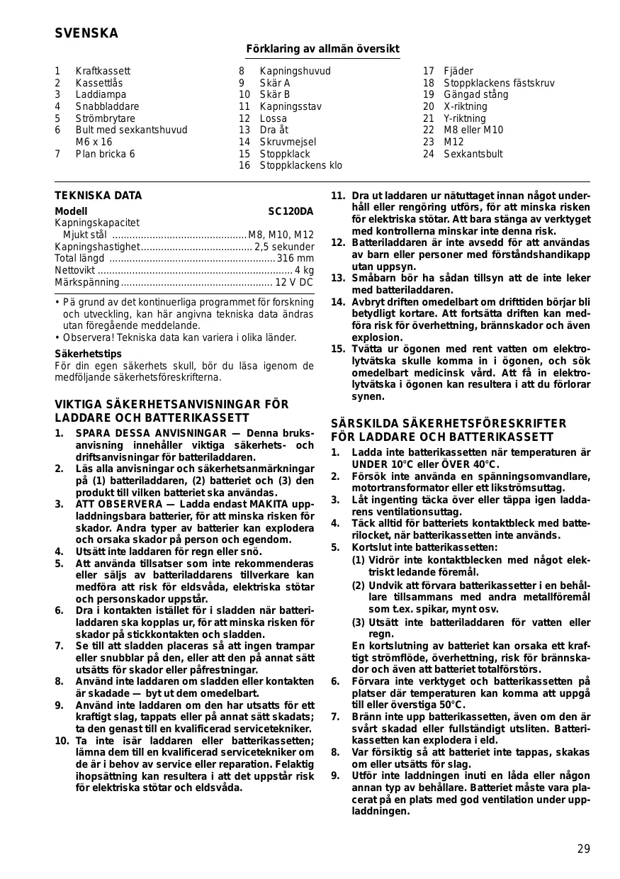 Kapningshuvud Skär A Skär B Kapningsstav Lossa Dra åt Skruvmejsel Stoppklack Stoppklackens klo TEKNISKA DATA Modell SC120DA Kapningskapacitet Mjukt stål ............................................... M8, M10, M12 Kapningshastighet ....................................... 2,5 sekunder Total längd .......................................................... 316 mm Nettovikt .................................................................... 4 kg Märkspänning ..................................................... 12 V DC