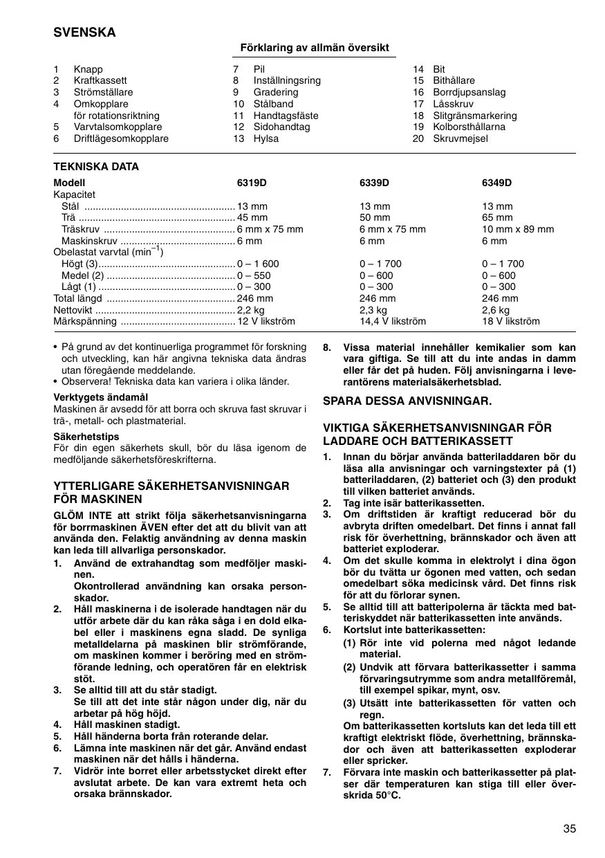 fôr rotationsrikining 11 Handtagsfäste 18 Slitgränsmarkering 5 Varvtalsomkopplare 12 Sidohandtag 19 Kolborsthällarna 6 Driftlägesomkopplare 13 Hylsa 20 Skruvmejsel TEKNISKA DATA Modell 6319D 6339D 6349D Kapacitet Stal 13mm 13 mm 50 mm 65 mm Träskruv. 6 mm x 75 mm 10 mm x 89 mm Maskinskruv 6mm 6mm Obelastat varvtal (min?) Hôgt (3). 0-1 700 0-1700 Medel (2) . 0-600 0-600 Lägt (1). 0- 300 0- 300 Total längd . 246 mm 246 mm Nettovikt .. 2,3 kg 2,6 kg Märkspänning 12 Vlikstrôm 14,4 V likstrôm 18 V likstrôm + Pâ grund av det kontinuerliga programmet fôr forskning och utveckling, kan här angivna tekniska data ändras utan féregäende meddelande. + Observeral Tekniska data kan variera i olika länder. Verktygets ändamäl Maskinen är avsedd fôr att borra och skruva fast skruvar i trä-, metall- och plastmaterial. Säkerhetstips Fôr din egen säkerhets skull, bôr du läsa igenom de medfôljande säkerhetstéreskrifterna.