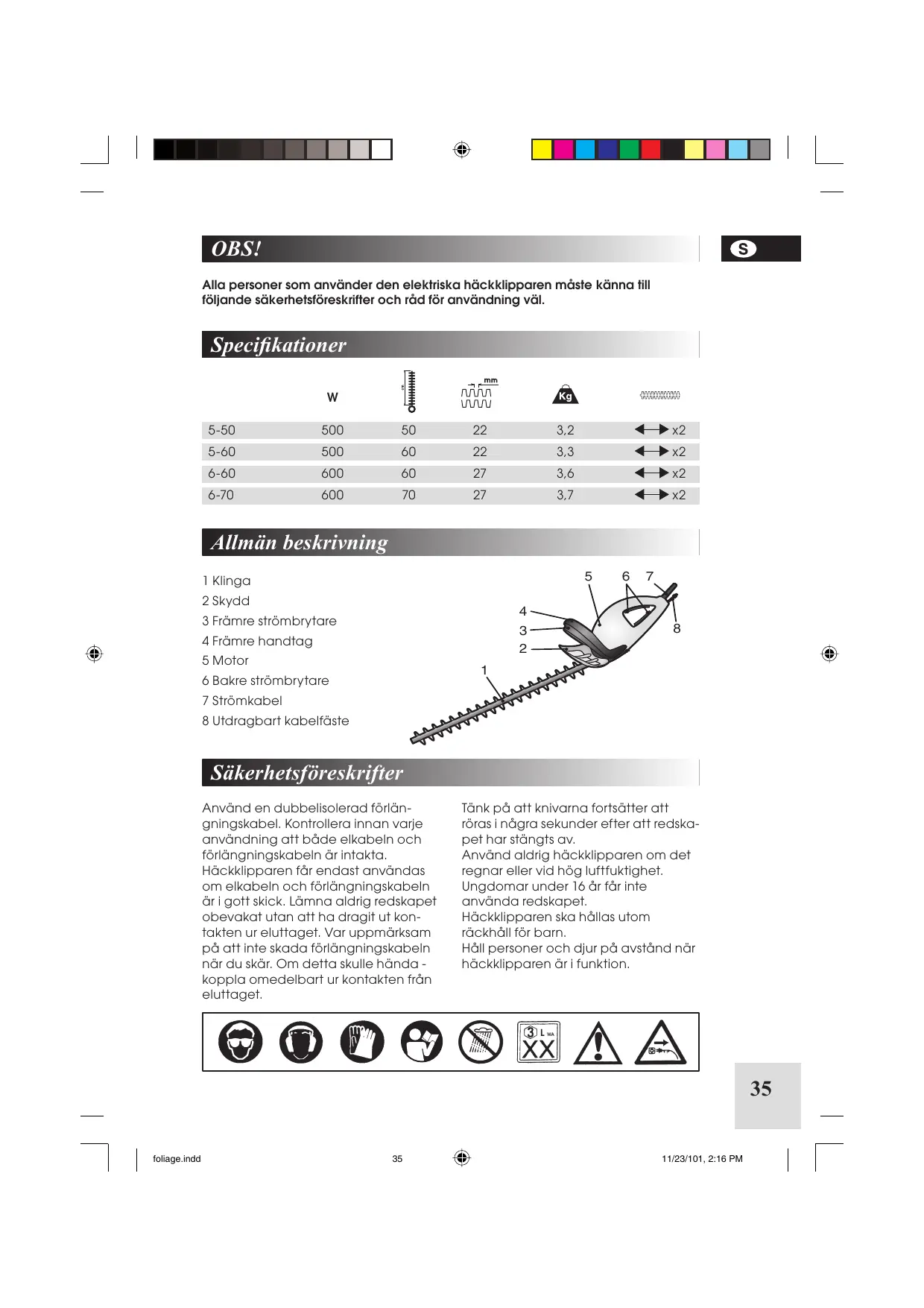 Vi rekommenderar dessutom att ovana användare instrueras om korrekt och saker användning av häckklipparen innan den tas i bruk.