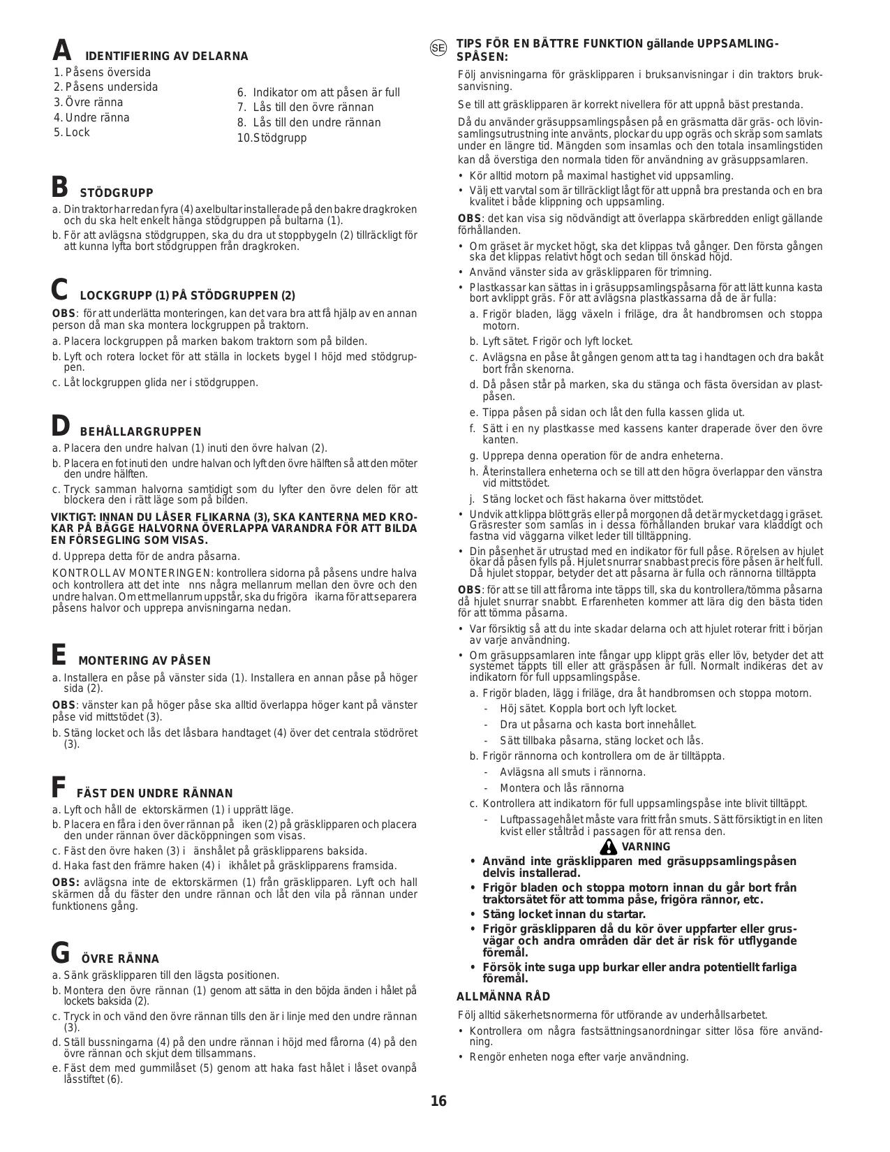 Följ anvisningarna för gräsklipparen i bruksanvisningar i din traktors bruksanvisning. Se till att gräsklipparen är korrekt nivellera för att uppnå bäst prestanda. Då du använder gräsuppsamlingspåsen på en gräsmatta där gräs- och lövinsamlingsutrustning inte använts, plockar du upp ogräs och skräp som samlats under en längre tid. Mängden som insamlas och den totala insamlingstiden kan då överstiga den normala tiden för användning av gräsuppsamlaren.