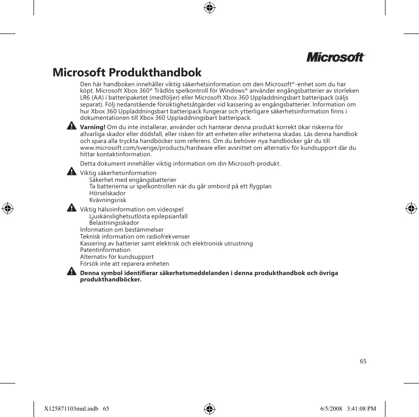 Microsoft Microsoft Produkthandbok Den här handboken innehäller viktig säkerhetsinformation om den Microsoft®-enhet som du har Kôpt. Microsoft Xbox 360” Trädlés spelkontroll fôr Windows” använder engängsbatterier av storleken LR6 (AA) i batteripeketet (medfèljer) eller Microsoft Xbox 360 Uppladdningsbart batteripack (säljs separat). Fôlj nedanstéende fôrsiktighetsätgärder vid kassering av engängsbatterier. Information om hur Xbox 360 Uppladdningsbart batteripack fungerar och ytterligare säkerhetsinformation finns i dokumentationen till Xbox 360 Uppladdningsbart batteripack À varning! Om du inte installerar, använder och hanterar denna produkt korrekt ôkar riskerna for allvarlige skador eller dôdsfall eller risken fôr att enheten eller enheterna skadas. Läs denna handbok ch spara alla tryckta handbôcker som referens. Om du behüver nya handbôcker gâr du til wwwmicrosoft.com/sverige/products/hardware eller avsnittet om alternati for kundsupport dr du hittar kontaktinformation Detta dokument innehäller viktig information om din Microsoft-produkt À vxtig säkerhetsinformation Säkerhet med engängsbatterier Te batterierna ur spelkontrollen när du gr ombord pà ettflygplan Hôrselskador Kvävningsrisk À xt hälsoinformation om videospel Ljuskänslighetsutiôsta epilepsianfall Belastningsskador Information om bestämmelser Teknisk information om radiofrekvenser Kassering av batterier samt elektrisk och elektronisk utrustning Patentinformation Alternativ fôr kundsupport Fôrsôk inte att reparera enheten erar säkerhetsmeddelanden i denna produkthandbok och ëvriga Denna symbol produkthandbôcker