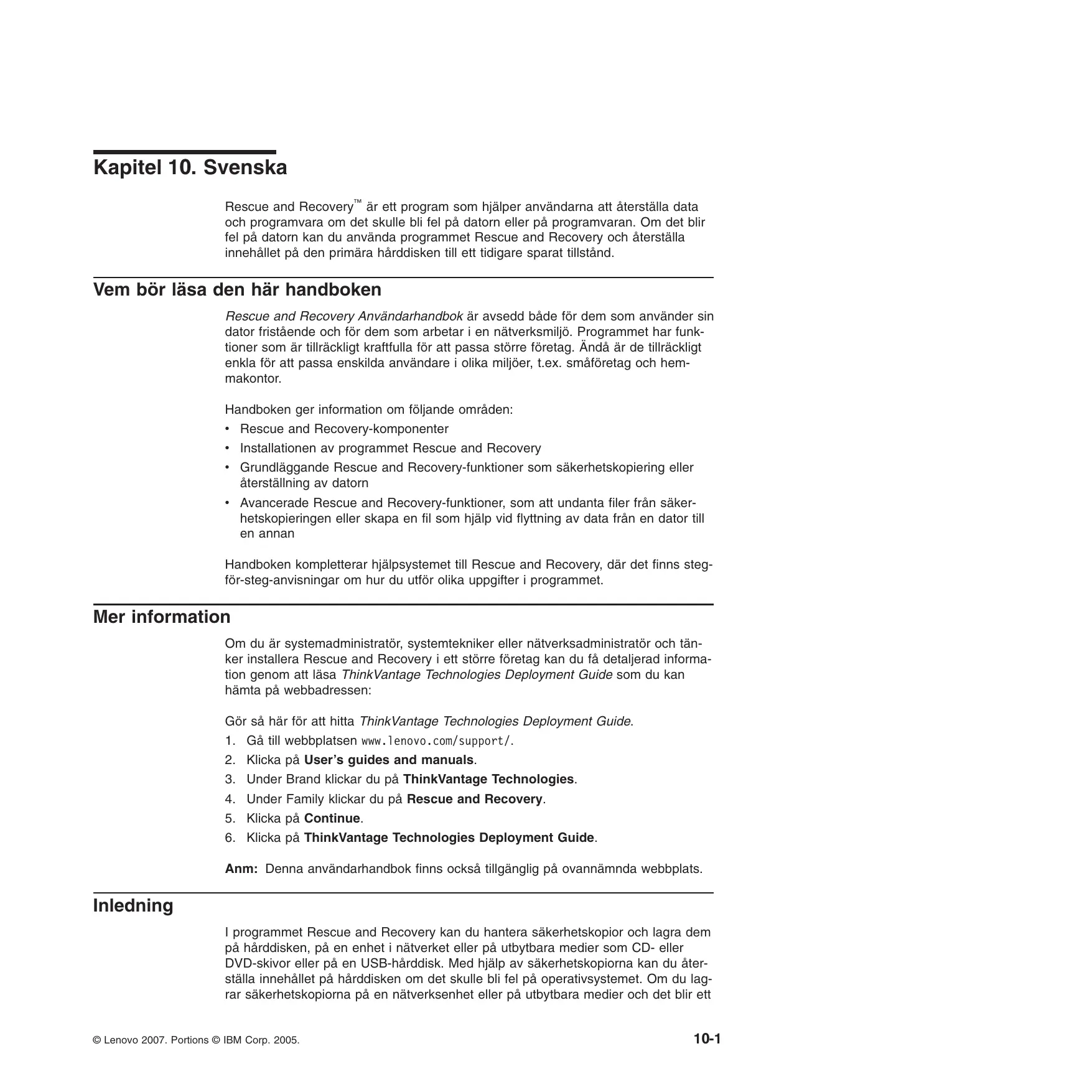 9-10 Rescue and Recovery™ User’s Guide Kapitel 10. Svenska Rescue and Recovery™ är ett program som hjälper användarna att återställa data och programvara om det skulle bli fel på datorn eller på programvaran. Om det blir fel på datorn kan du använda programmet Rescue and Recovery och återställa innehållet på den primära hårddisken till ett tidigare sparat tillstånd. Vem bör läsa den här handboken Rescue and Recovery Användarhandbok är avsedd både för dem som använder sin dator fristående och för dem som arbetar i en nätverksmiljö. Programmet har funktioner som är tillräckligt kraftfulla för att passa större företag. Ändå är de tillräckligt enkla för att passa enskilda användare i olika miljöer, t.ex. småföretag och hemmakontor. Handboken ger information om följande områden: v Rescue and Recovery-komponenter v Installationen av programmet Rescue and Recovery v Grundläggande Rescue and Recovery-funktioner som säkerhetskopiering eller återställning av datorn v Avancerade Rescue and Recovery-funktioner, som att undanta filer från säkerhetskopieringen eller skapa en fil som hjälp vid flyttning av data från en dator till en annan Handboken kompletterar hjälpsystemet till Rescue and Recovery, där det finns stegför-steg-anvisningar om hur du utför olika uppgifter i programmet. Mer information Om du är systemadministratör, systemtekniker eller nätverksadministratör och tänker installera Rescue and Recovery i ett större företag kan du få detaljerad information genom att läsa ThinkVantage Technologies Deployment Guide som du kan hämta på webbadressen: Gör så här för att hitta ThinkVantage Technologies Deployment Guide.