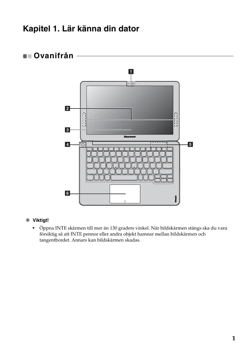 Kapitel 1. Lär känna din dator es Ovanifrän + Oppna INTE skärmen till mer än 130 graders vinkel. När bildskärmen stängs ska du vara frsiktig sà att INTE pennor eller andra objekt hamnar mellan bildskärmen och tangentbordet. Annars kan bildskärmen skadas.
