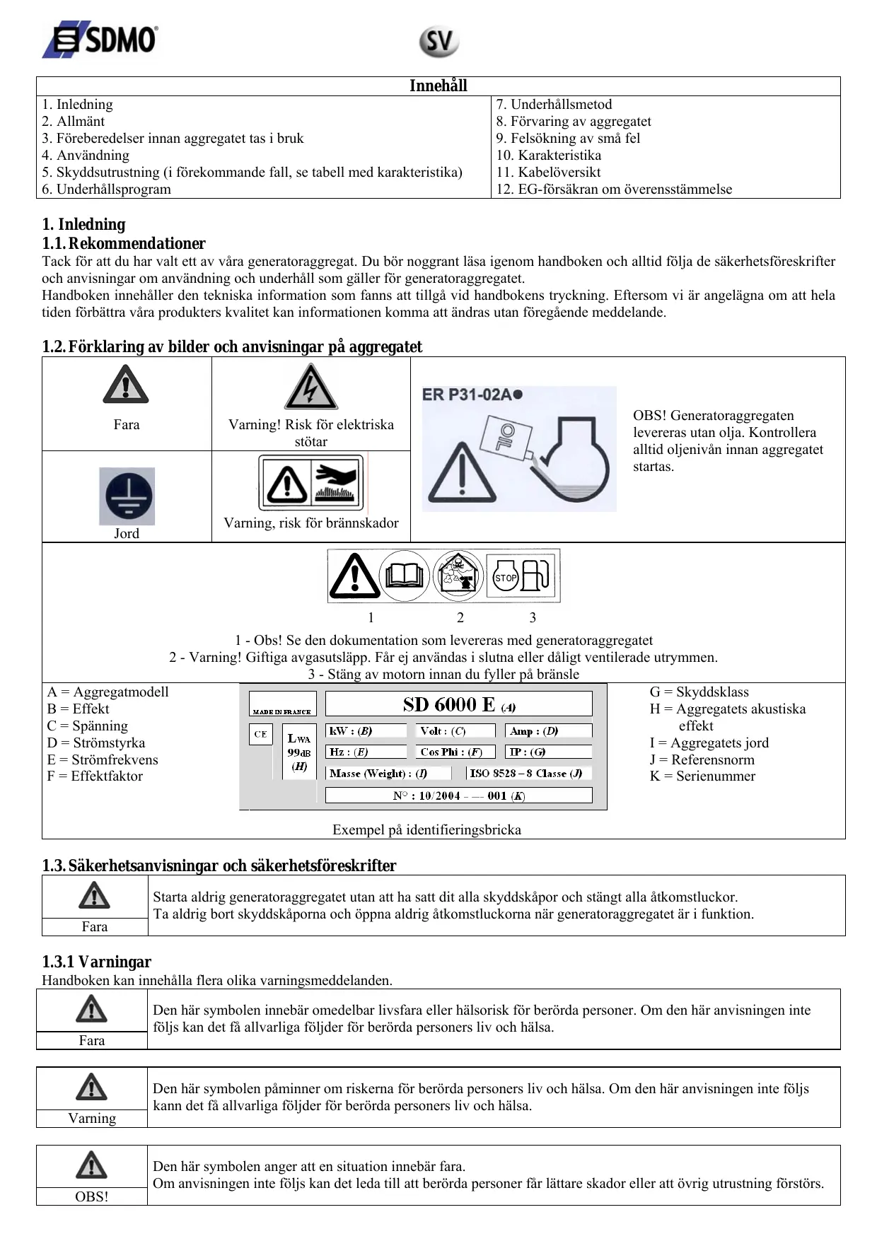 1.1. Rekommendationer Tack för att du har valt ett av våra generatoraggregat. Du bör noggrant läsa igenom handboken och alltid följa de säkerhetsföreskrifter och anvisningar om användning och underhåll som gäller för generatoraggregatet. Handboken innehåller den tekniska information som fanns att tillgå vid handbokens tryckning. Eftersom vi är angelägna om att hela tiden förbättra våra produkters kvalitet kan informationen komma att ändras utan föregående meddelande. 1.2. Förklaring av bilder och anvisningar på aggregatet Fara Jord OBS! Generatoraggregaten levereras utan olja. Kontrollera alltid oljenivån innan aggregatet startas. Varning! Risk för elektriska stötar Varning, risk för brännskador