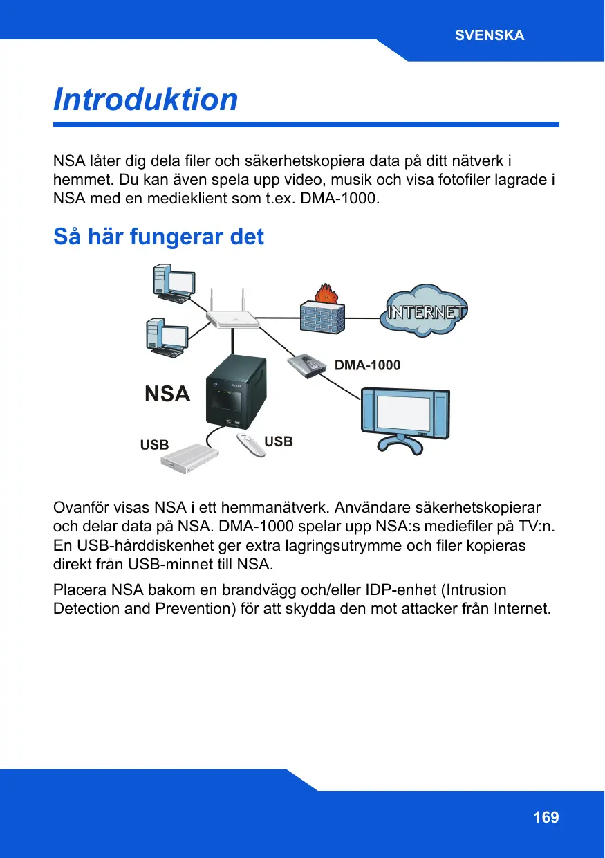 Ovanför visas NSA i ett hemmanätverk. Användare säkerhetskopierar och delar data på NSA. DMA-1000 spelar upp NSA:s mediefiler på TV:n. En USB-hårddiskenhet ger extra lagringsutrymme och filer kopieras direkt från USB-minnet till NSA. Placera NSA bakom en brandvägg och/eller IDP-enhet (Intrusion Detection and Prevention) för att skydda den mot attacker från Internet.
