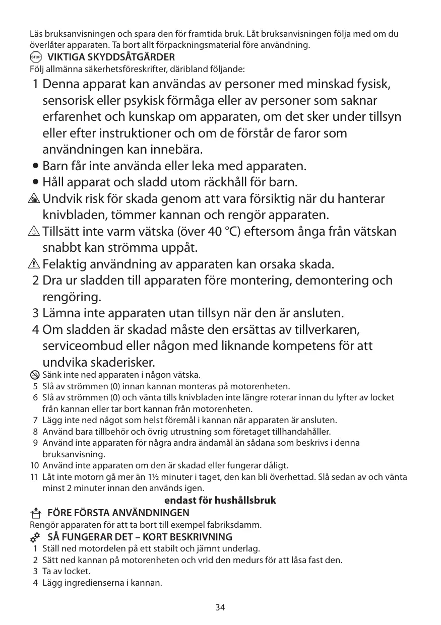 1 Denna apparat kan användas av personer med minskad fysisk, sensorisk eller psykisk förmåga eller av personer som saknar erfarenhet och kunskap om apparaten, om det sker under tillsyn eller efter instruktioner och om de förstår de faror som användningen kan innebära. • Barn får inte använda eller leka med apparaten. • Håll apparat och sladd utom räckhåll för barn. s Undvik risk för skada genom att vara försiktig när du hanterar knivbladen, tömmer kannan och rengör apparaten. u Tillsätt inte varm vätska (över 40 °C) eftersom ånga från vätskan snabbt kan strömma uppåt. c Felaktig användning av apparaten kan orsaka skada. 2 Dra ur sladden till apparaten före montering, demontering och rengöring. 3 Lämna inte apparaten utan tillsyn när den är ansluten. 4 Om sladden är skadad måste den ersättas av tillverkaren, serviceombud eller någon med liknande kompetens för att undvika skaderisker.