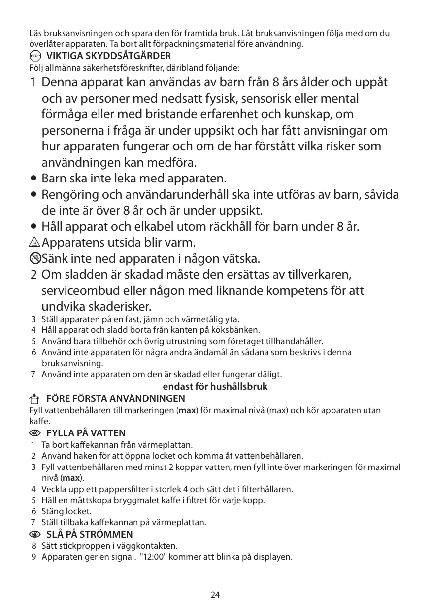 1 Denna apparat kan användas av barn från 8 års ålder och uppåt och av personer med nedsatt fysisk, sensorisk eller mental förmåga eller med bristande erfarenhet och kunskap, om personerna i fråga är under uppsikt och har fått anvisningar om hur apparaten fungerar och om de har förstått vilka risker som användningen kan medföra. • Barn ska inte leka med apparaten. • Rengöring och användarunderhåll ska inte utföras av barn, såvida de inte är över 8 år och är under uppsikt. • Håll apparat och elkabel utom räckhåll för barn under 8 år. h Apparatens utsida blir varm. lSänk inte ned apparaten i någon vätska. 2 Om sladden är skadad måste den ersättas av tillverkaren, serviceombud eller någon med liknande kompetens för att undvika skaderisker. 3 4 5 6