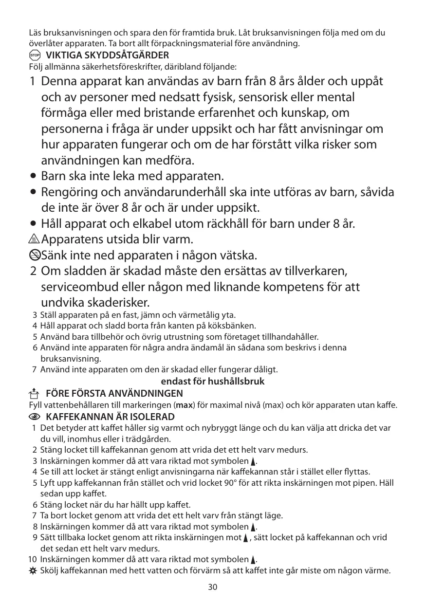 C KAFFEKANNAN ÄR ISOLERAD 1 Det betyder att kaffet håller sig varmt och nybryggt länge och du kan välja att dricka det var du vill, inomhus eller i trädgården. 2 Stäng locket till kaffekannan genom att vrida det ett helt varv medurs. 3 Inskärningen kommer då att vara riktad mot symbolen (. 4 Se till att locket är stängt enligt anvisningarna när kaffekannan står i stället eller flyttas. 5 Lyft upp kaffekannan från stället och vrid locket 90° för att rikta inskärningen mot pipen. Häll sedan upp kaffet. 6 Stäng locket när du har hällt upp kaffet. 7 Ta bort locket genom att vrida det ett helt varv från stängt läge. 8 Inskärningen kommer då att vara riktad mot symbolen (. 9 Sätt tillbaka locket genom att rikta inskärningen mot ( , sätt locket på kaffekannan och vrid det sedan ett helt varv medurs. 10 Inskärningen kommer då att vara riktad mot symbolen (. , Skölj kaffekannan med hett vatten och förvärm så att kaffet inte går miste om någon värme. 30