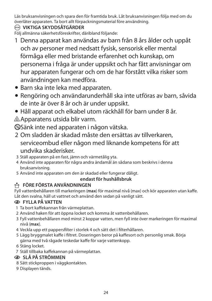 - Håll apparat och elkabel utom räckhåll för barn under 8 år. h Apparatens utsida blir varm. lSänk inte ned apparaten i någon vätska. 2 Om sladden är skadad måste den ersättas av tillverkaren, serviceombud eller någon med liknande kompetens för att undvika skaderisker. 3 Ställ apparaten på en fast, jämn och värmetålig yta. 4 Använd inte apparaten för några andra ändamål än sådana som beskrivs i denna bruksanvisning. 5 Använd inte apparaten om den är skadad eller fungerar dåligt. endast för hushållsbruk U FÖRE FÖRSTA ANVÄNDNINGEN Fyll vattenbehållaren till markeringen (max) för maximal nivå (max) och kör apparaten utan kaffe. Låt den svalna, häll ut vattnet och använd den sedan på vanligt sätt.