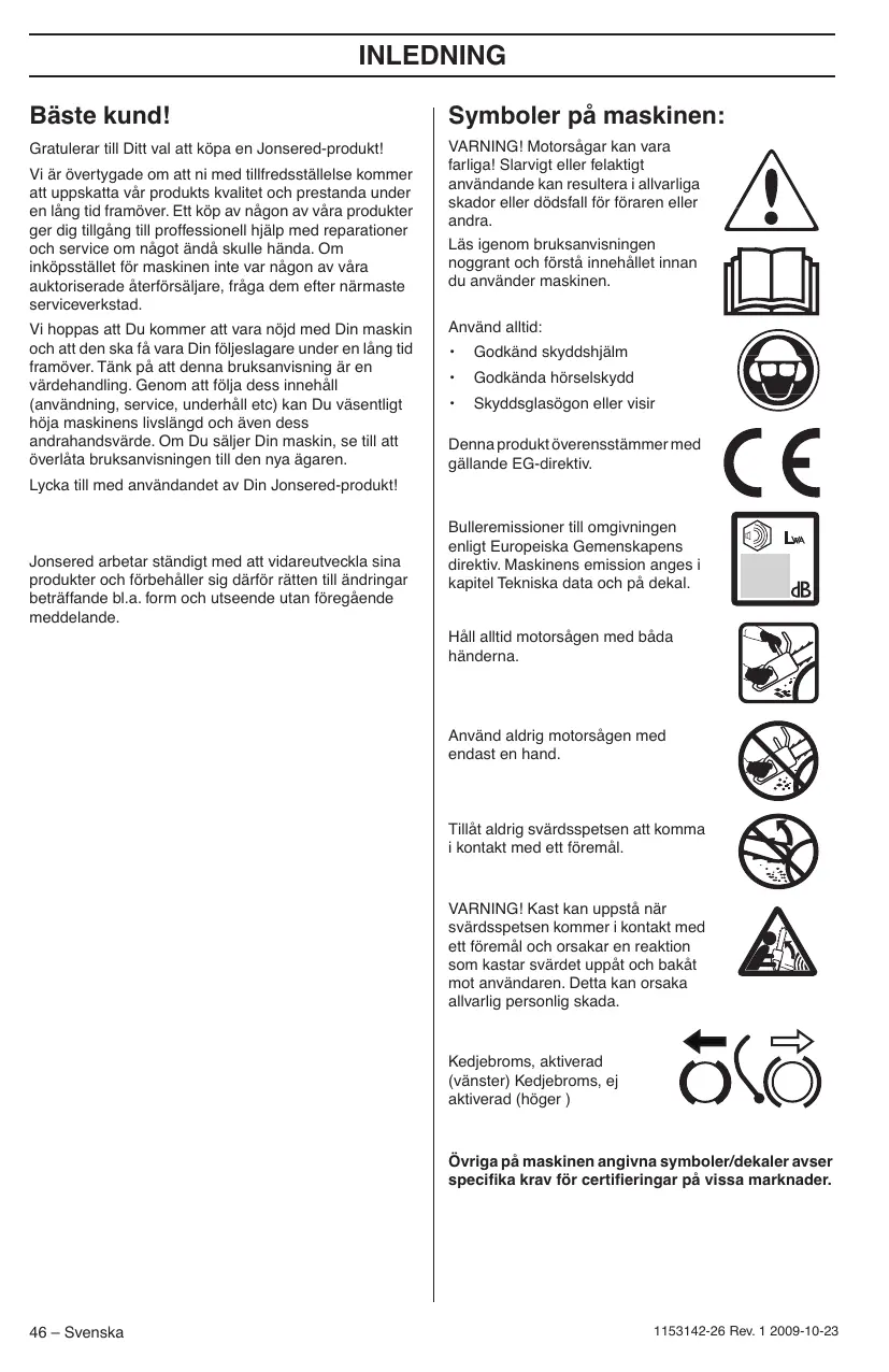 Nous sommes persuadés que vous apprécierez la qualité et les performances de nos produits pendant de longues années. L’achat d’un de nos produits vous garantit une assistance professionnelle au niveau du service et des réparations en cas de besoin. Si la machine n’a pas été achetée chez un de nos revendeurs autorisés, demandez à un revendeur l’adresse de l’atelier d’entretien le plus proche. Nous espérons que cette machine vous donnera toute satisfaction et qu’elle vous accompagnera pendant de longues années. N’oubliez pas que ce manuel d’utilisation est important. En suivant les instructions qu’il contient (utilisation, révision, entretien, etc.), il est possible d’allonger considérablement la durée de vie de la machine et d’augmenter sa valeur sur le marché de l’occasion. En cas de vente de la machine, ne pas oublier de remettre le manuel d’utilisation au nouveau propriétaire. Bonne chance avec votre nouveau produit Jonsered!