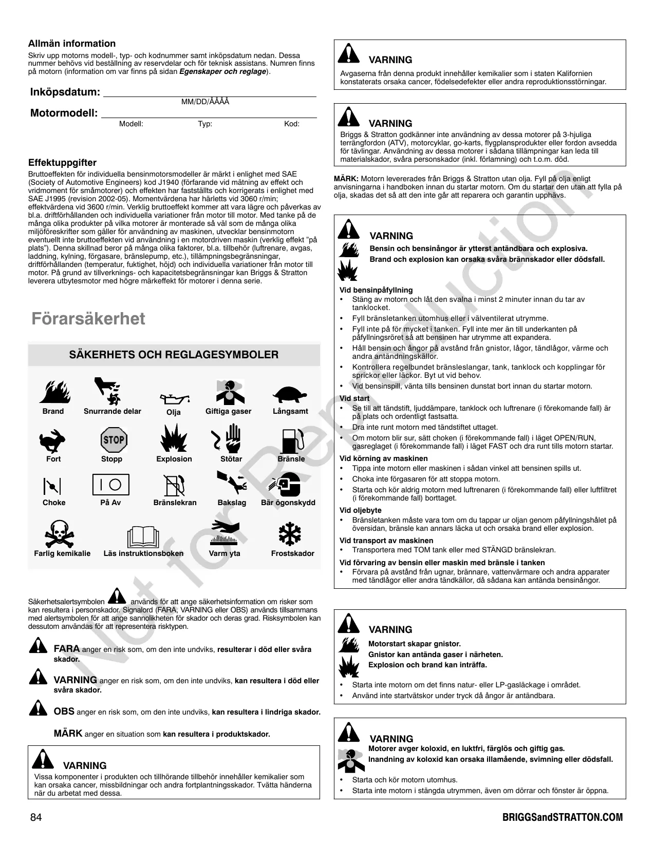 Starta inte motorn om det finns natur- eller LP-gasläckage i området. Använd inte startvätskor under tryck då ångor är antändbara. OBS anger en risk som, om den inte undviks, kan resultera i lindriga skador. MÄRK anger en situation som kan resultera i produktskador. VARNING Motorer avger koloxid, en luktfri, färglös och giftig gas. Inandning av koloxid kan orsaka illamående, svimning eller dödsfall. VARNING Vissa komponenter i produkten och tillhörande tillbehör innehåller kemikalier som kan orsaka cancer, missbildningar och andra fortplantningsskador. Tvätta händerna när du arbetat med dessa.