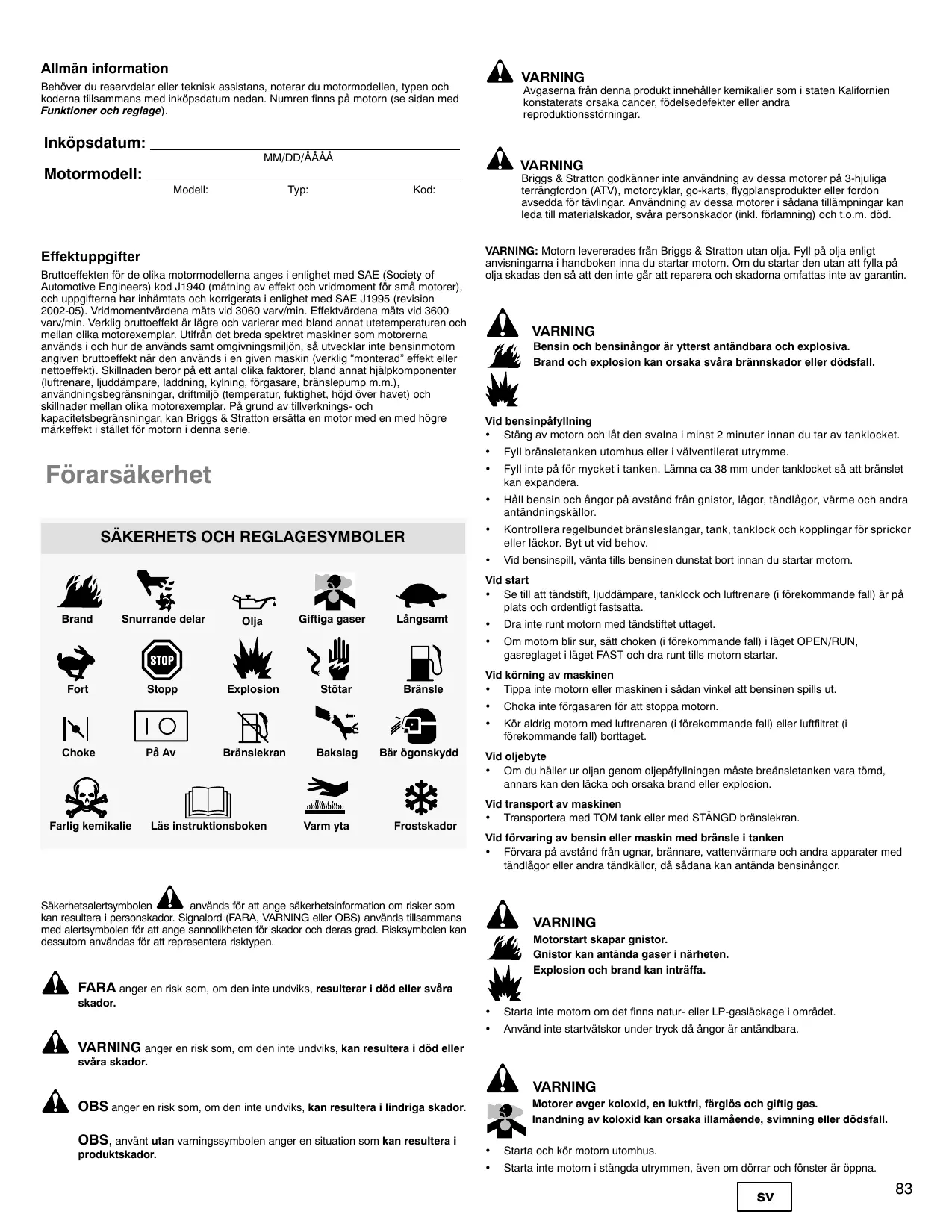 Brand oïja Giftiga gaser Längsamt Fort Explosion Stôtar Bränsle Choke Bränsiekran Bakslag Bär ôgonskydd tin, SE Farlig kemikalie Läs instruktionsboken Varm yta Frostskador Säkerhetsalertsymbolen À används fôr att ange säkerhetsinformation om risker som kan resultera i personskador. Signalord (FARA, VARNING eller OBS) används tillsammans med alertsymbolen fôr att ange sannolikheten fôr skador och deras grad. Risksymbolen kan dessutom användas für att representera risktypen. À FARA anger en risk som, om den inte undviks, resulterar i dôd eller svära skador. À VARNING anger en risk som, om den inte unviks, kan resultera i dôd eller svära skador. À OBS anger en risk som, om den inte undviks, kan resultera i lindriga skador. OBS, använt utan varningssymbolen anger en situation som kan resultera i produktskador. À VARNING Avgaserna frân denna produkt innehäller kemikalier som i staten Kalifornien konstaterats orsaka cancer, fdelsedefekter eller andra reproduktionsstôrningar. À VARNING Briggs & Stratton godkänner inte användning av dessa motorer pâ 3-hjuliga terrängfordon (ATV), motorcyklar, go-karts, flygplansprodukter eller fordon avsedda fôr tävlingar. Användning av dessa motorer i sädana tilämpningar kan leda till materialskador, svära personskador (inkl. fôrlamning) och t.0.m. dôd. VARNING: Motorn levererades frän Briggs & Stratton utan olja. Fyll pà olja enligt anvisningamna i handboken inna du startar moto. Om du startar den utan att fylla pà olja skadas den sà att den inte gär att reparera och skadoma omfattas inte av garantin. À VARNING Hs Bensin och bensinängor är ytterst antändbara och explosiva. Brand och explosion kan orsaka svära brännskador eller dôdsfall. Vid bensinpätylining + Stäng av motom och lât den svalna i minst 2 minuter innan du tar av tanklocket. + Fyllbränsletanken utomhus eller i välventilerat utrymme. + Fyllinte pâ fôr mycket itanken. Lämna ca 38 mm under tanklocket sà att bränslet kan expandera + Häll bensin och ängor pà avständ frän gnistor, lägor, tändlägor, värme och andra antändningskällor. + Kontrollera regelbundet bränsleslangar, tank, tanklock och kopplingar fôr sprickor eller läckor. Byt ut vid behov. + Vid bensinspill, vänta tills bensinen dunstat bort innan du startar motorn. Vid start + Se til att tändstift, juddämpare, tanklock och luftrenare (i fôrekommande fall) är pà plats och ordentligt fastsatta. + Drainte runt motom med tändstiftet uttaget. + Om motom blir sur, sätt choken (i frekommande fall i läget OPEN/RUN, gasreglaget iläget FAST och dra runt tlls motorn startar. Vid kôrning av maskinen + Tippainte motor eller maskinen i sädan vinkel att bensinen spills ut. + Choka inte férgasaren fôr ait stoppa motorn. + Kôr aldrig motorn med luftrenaren (i fôrekommande fall) eller luftitret (i fôrekommande fall borttaget. Vid oljebyte + Om du häller ur oljan genom oljepäfylningen mäste breänsletanken vara tômd, annars kan den läcka och orsaka brand eller explosion. Vid transport av maskinen . + Transportera med TOM tank eller med STÂNGD bränslekran. Vid fôrvaring av bensin eller maskin med bränsle i tanken + Fôrvara pä avständ frân ugnar, brännare, vattenvärmare och andra apparater med tändlägor eller andra tändkällor, dà sädana kan antända bensinängor. VARNING Motorstart skapar gnistor. Gnistor kan antända gaser i närheten. Explosion och brand kan inträffa.
