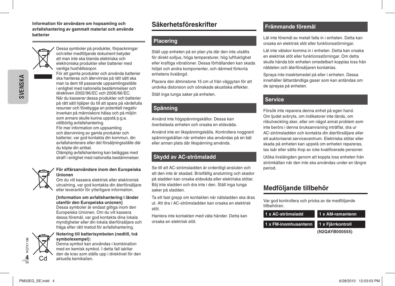 PM02EG_SE.indd 3 6/28/2010 12:03:03 PM Information för användare om hopsamling och avfallshantering av gammalt material och använda batterier Säkerhetsföreskrifter Placering RQTX1188 SVENSKA Dessa symboler på produkter, förpackningar och/eller medföljande dokument betyder att man inte ska blanda elektriska och elektroniska produkter eller batterier med vanliga hushållssopor. För att gamla produkter och använda batterier ska hanteras och återvinnas på rätt sätt ska man ta dem till passande uppsamlingsställe i enlighet med nationella bestämmelser och direktiven 2002/96/EC och 2006/66/EC. När du kasserar dessa produkter och batterier på rätt sätt hjälper du till att spara på värdefulla resurser och förebygga en potentiell negativ inverkan på människors hälsa och på miljön som annars skulle kunna uppstå p.g.a. otillbörlig avfallshantering. För mer information om uppsamling och återvinning av gamla produkter och batterier, var god kontakta din kommun, din avfallshanterare eller det försäljningsställe där du köpte din artikel. Olämplig avfallshantering kan beläggas med straff i enlighet med nationella bestämmelser.