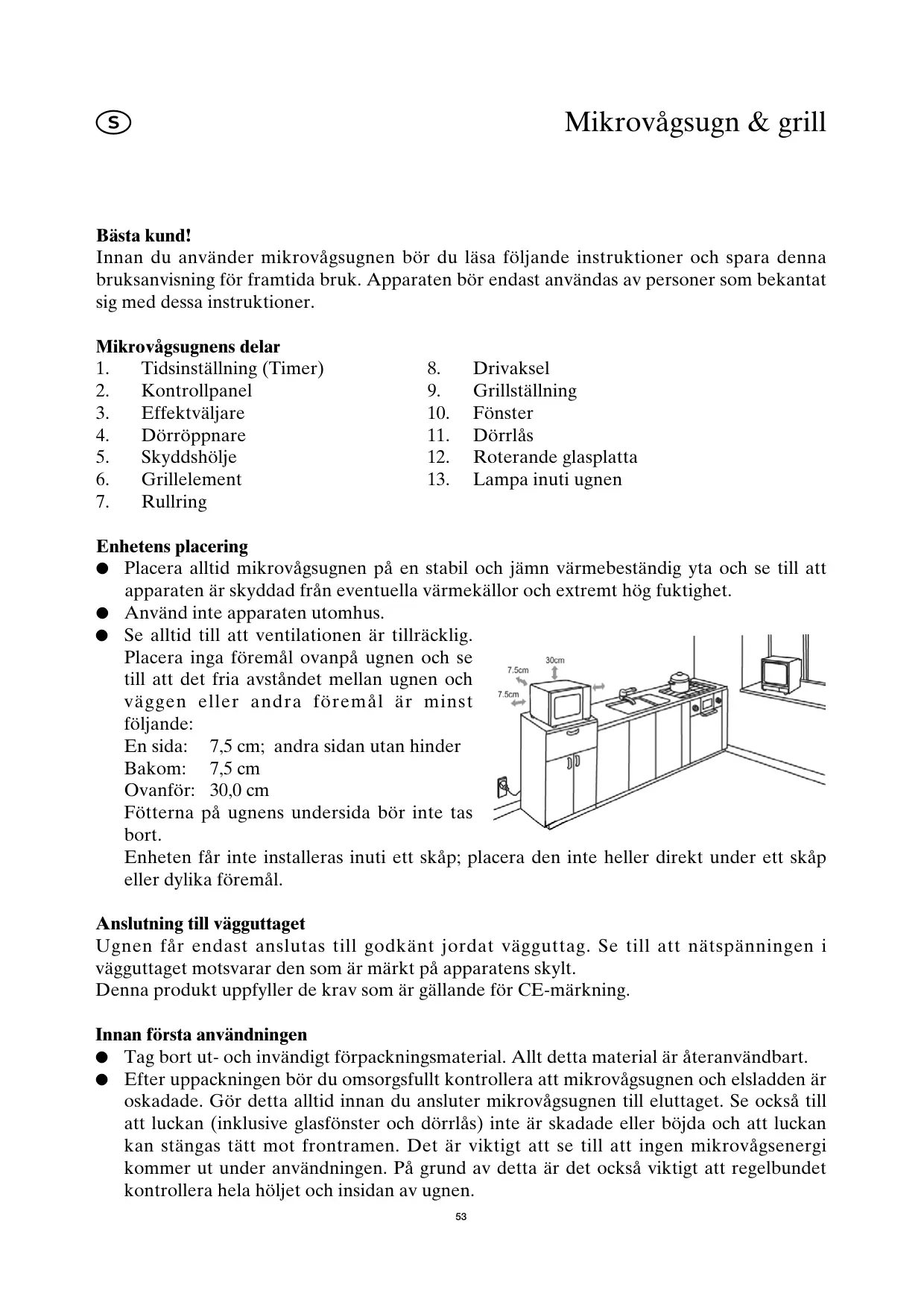 Drivaksel Grillställning Fönster Dörrlås Roterande glasplatta Lampa inuti ugnen Enhetens placering ● Placera alltid mikrovågsugnen på en stabil och jämn värmebeständig yta och se till att apparaten är skyddad från eventuella värmekällor och extremt hög fuktighet. ● Använd inte apparaten utomhus. ● Se alltid till att ventilationen är tillräcklig. Placera inga föremål ovanpå ugnen och se till att det fria avståndet mellan ugnen och väggen eller andra föremål är minst följande: En sida: 7,5 cm; andra sidan utan hinder Bakom: 7,5 cm Ovanför: 30,0 cm Fötterna på ugnens undersida bör inte tas bort. Enheten får inte installeras inuti ett skåp; placera den inte heller direkt under ett skåp eller dylika föremål. Anslutning till vägguttaget Ugnen får endast anslutas till godkänt jordat vägguttag. Se till att nätspänningen i vägguttaget motsvarar den som är märkt på apparatens skylt. Denna produkt uppfyller de krav som är gällande för CE-märkning. Innan första användningen ● Tag bort ut- och invändigt förpackningsmaterial. Allt detta material är återanvändbart. ● Efter uppackningen bör du omsorgsfullt kontrollera att mikrovågsugnen och elsladden är oskadade. Gör detta alltid innan du ansluter mikrovågsugnen till eluttaget. Se också till att luckan (inklusive glasfönster och dörrlås) inte är skadade eller böjda och att luckan kan stängas tätt mot frontramen. Det är viktigt att se till att ingen mikrovågsenergi kommer ut under användningen. På grund av detta är det också viktigt att regelbundet kontrollera hela höljet och insidan av ugnen.