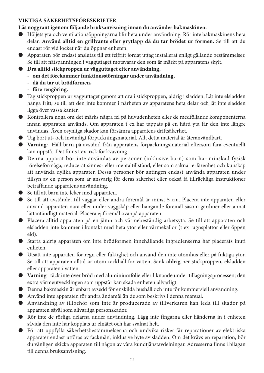 Holjets yta och ventilationsöppningarna blir heta under användning. Rör inte bakmaskinens heta delar. Använd alltid en grillvante eller grytlapp dà du tar brodet ur formen. Se till att du endast rör vid locket nar du öppnar encheten.
