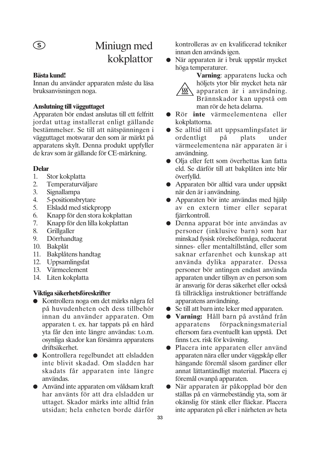 Varning: apparatens lucka och höljets ytor blir mycket heta nar apparaten ar i anzünding. Brännskador kan uppsta om man rör de heta delarna.