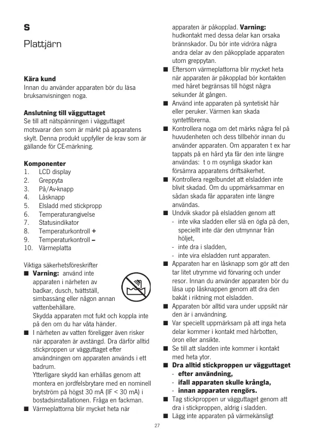 Plattjärn Kära kund Innan du använder apparaten bôr du läsa bruksanvisningen noga: Anslutning til vägguttaget Se il attnätspéänningen i vägguttaget motsarar den som är märkt pà apparatens sky. Denna produkt uppfyler de krav som är gällande for CE-märkning, Komponenter LCD display Greppyta Pà/Avknapp Läsknapp Elsladd med stickpropp Temperaturangivelse Statusindikator Temperaturkontrol + Temperaturkontrol =