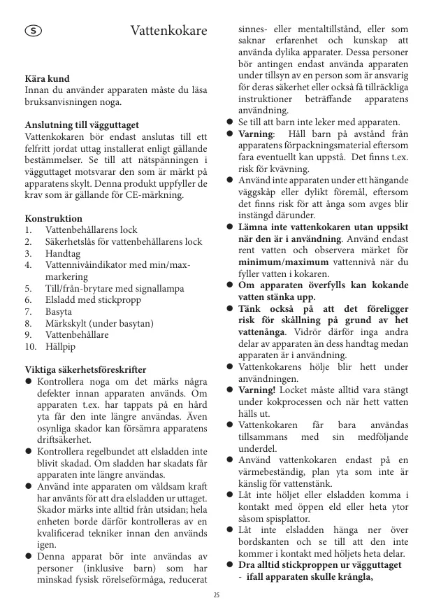 - Lämna inte vattenkokaren utan uppsikt nar den ar i använding. Använd endast rent vatten och observa market for minimum/maximum vattenivá nar du fyller vatten i kokaren.
