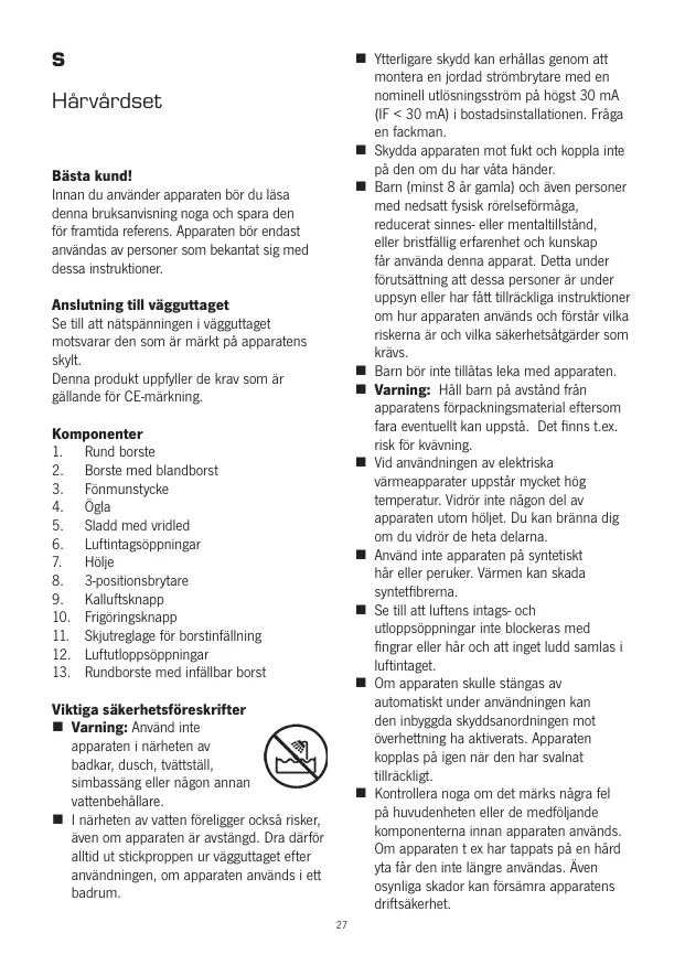 ktiga säkerhetsfüreskrifter Varning: Anvand inte apparaten i närheten av badkar, dusch, tättstäl, simbassäng eller nâgon annan vattenbehällare. 1 närheten av vatten fôreligger ocksä risker, även om apparaten är avstängd. Dra dârfor altid ut stickproppen ur vägguttaget efter arvändningen, om apparaten används iett badrum. M Yiterigare skydd kan erhällas genom att montera en jordad strômbrytare med en nominell utlésningsstrm pâ hôgst 30 mA {UF < 30 mA] i bostadsinstalltionen. Frâga en fackman. Skydda apparaten mot fukt och koppla inte p den om du har vâta händer. Bar (minst 8 är gamia) och även personer med nedsatt ysisk rôrelseformäga, reducerat sinnes- eller mentaltilständ, eller brstéllig erfarenhet och kunskap fr använda denna apparat. Detta under forutsättning att dessa personer är under uppsyn eller har fätt tllräckiga instruktioner om hur apparaten används och fôrstérvilka riskerna är och via säkerhetsätgärder som krävs. Bar bôr intetiltas leka med apparaten. Varning: Häl! barn pà avständ frân apparatens forpackningsmaterial eftersom fara eventuelt kan uppstä. Det finns Lex, risk for kväuning. Vid användningen av elektriska varmeapparater uppstär mycket hôg temperatur. Vidrèr inte nâgon del av apparaten utom hôlet. Du kan bränna dig om du vidrèr de heta dela. Anénd inte apparaten pà syntetiskt hèr eller peruker. Värmen kan skada syntetfibrerna. Se til attluftens intags- och utloppsäppningar inte blockeras med fingrar eller hâr och att inget ludd samlas à luftintaget Om apparaten skulle stängas av automatiskt under användningen kan den inbyggda skyddsanordningen mot üverhettning ha aktverats. Apparaten Kopples pà igen nâr den har svalnat tilrckigt Kontrollera noga om det mârks nägra fel pà huvudenheten eller de medfôljande Komponenterna innan apparaten används. Om apparaten t ex har tappats pà en härd vla fâr den inte längre användas. Âven osynliga skador kan fôrsämra apparatens driftsäkerhet