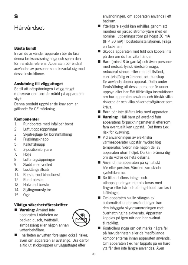 ktiga säkerhetsféreskrifter M Varning: Anvand inte apparaten i nârheten av badkar, dusch, vätistäl, simbassäng eller négon annan vattenbehällar. 1 närheten av vatten foreligger ocksä rsker, även om apparaten är avstängd. Dra darfor altid ut stickproppen ur vägguttaget efter användningen, om apparaten används iett badrum. Ytterligare skydd kan erhällas genom att montera en jordad strmbrytare med en nominell utlésningsstrm pâ hôgst 30 mA {UF < 30 mA] i bostadsinstalltionen. Fräga en fackman. Skydda apparaten mot fukt och koppla inte pà den om du har vâta händer. Bar (minst 8 är gamla) och även personer med nedsatt fysisk rôrelseformäga, reducerat sinnes- eller mentatilständ, eller brstéllig erfarenhet och kunskap fr anvanda denna apparat. Detta under forutsättning att dessa personer är under uppsyn eller ar fätt tllräckiga instruktioner om hur apparaten används och fôrstérvilka riskerna är och via säkerhetsätgärder som krävs. Bar bôr intetiltas leka med apparaten. Varning: Häll barn pà avständ frân apparatens forpackningsmaterial eftersom fara eventuelt kan uppstä. Det finns Lex, risk for kväuning. Vid användningen av elektriska varmeapparater uppstär mycket hôg temperatur. idrèr inte nâgon del av apparaten utom hôlet. Du kan bränna dig om du vidrèr de heta dela. Annd inte apparaten pà syntetiskt hâr eller peruker. Värmen kan skada syntetfibremna. Se til attluftens intags- och utloppsäppningar inte blockeras med fingrar eller hâr och att inget ludd samlas à luftintaget Om apparaten skulle stängas av automatiskt under användningen kan den inbyggda skyddsanordningen mot üverhettning ha aktiverats. Apparaten Kopples pà igen nâr den har svalnat tilrckligt Kontrollera noga om det mârks nägra fel pà huvudenheten eller de medfôljande Komponenterna innan apparaten används. Om apparaten t ex har tappats pà en härd vla fâr den inte längre användas. Âven