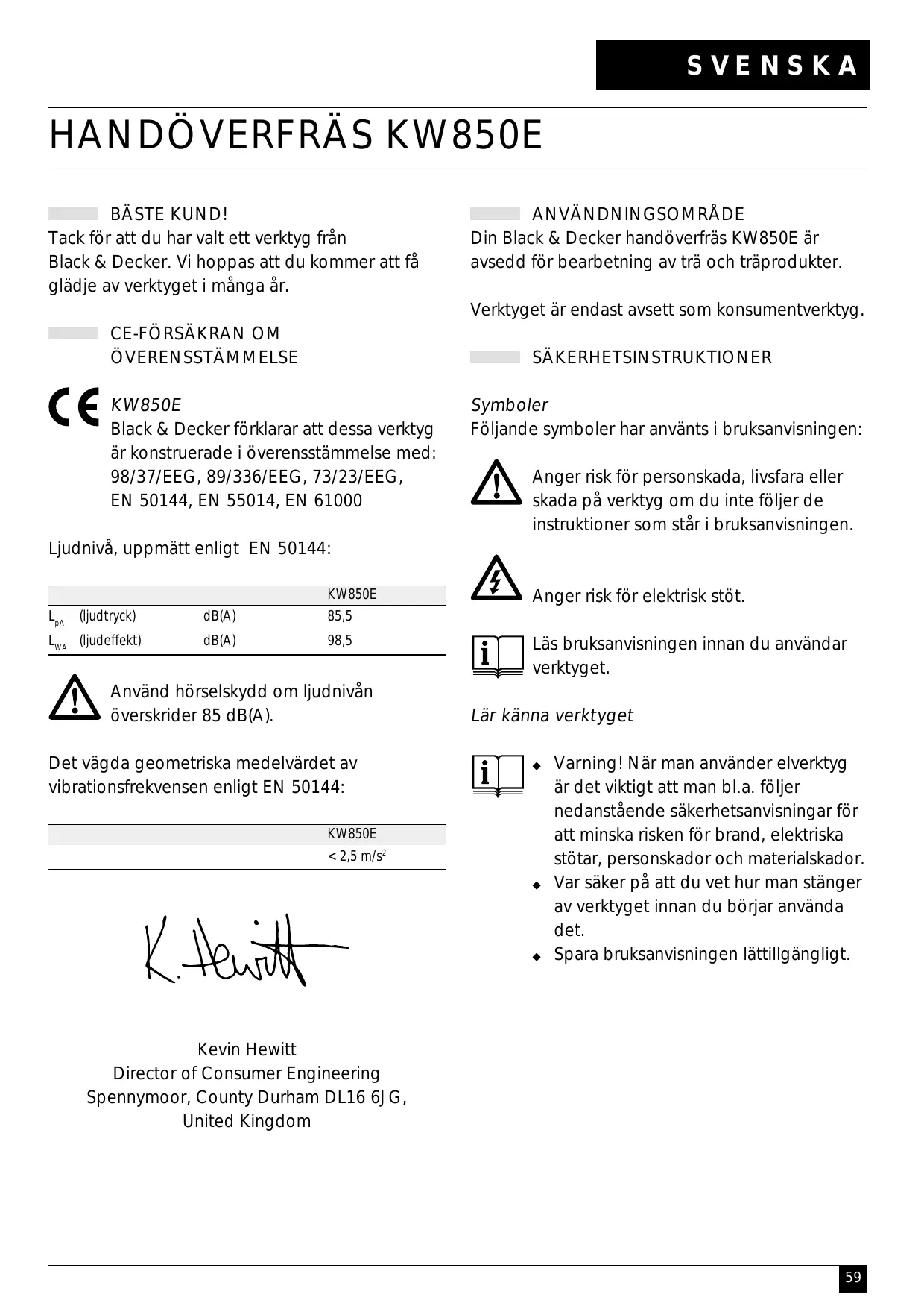 ÖVERENSSTÄMMELSE SÄKERHETSINSTRUKTIONER KW850E Black & Decker förklarar att dessa verktyg är konstruerade i överensstämmelse med: 98/37/EEG, 89/336/EEG, 73/23/EEG, EN 50144, EN 55014, EN 61000