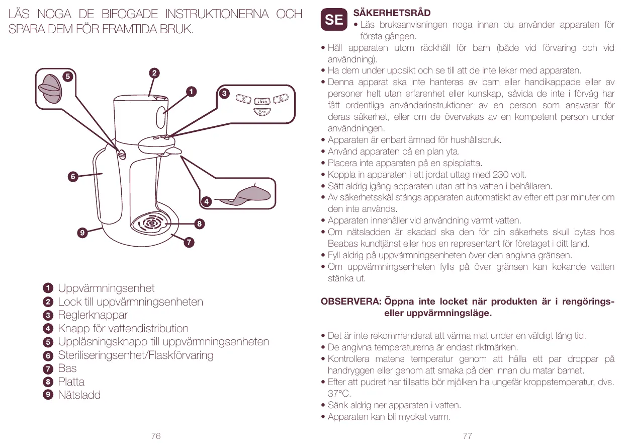 • Cet appareil n’est pas prévu pour être utilisé par des personnes (y compris les enfants) dont les capacités physiques, sensorielles ou mentales sont réduites, ou des personnes dénuées d’expérience ou de connaissance, sauf si elles ont pu bénéficier, par l’intermédiaire d’une personne responsable de leur sécurité, d’une surveillance ou d’instructions préalables concernant l’utilisation de l’appareil. • Votre appareil est conçu pour un usage exclusivement domestique. • Toujours utiliser l’appareil sur une surface plane. • Ne pas poser l’appareil sur une plaque électrique. • Toujours brancher l’appareil sur une prise 230 Volts + Terre. • Ne jamais faire fonctionner l’appareil sans eau dans la cuve. • Pour des raisons de sécurité, l’appareil s’arrête automatiquement après quelques minutes sans utilisation. • Par mesure de sécurité, si le câble d’alimentation est endommagé, il doit être remplacé par le service après-vente de Beaba ou de son représentant légal afin d’éviter un danger. • En utilisation, l’appareil contient de l’eau chaude. • Ne jamais remplir l’unité de chauffe au-delà de la limite indiquée. Si l’unité de chauffe est trop remplie, de l’eau bouillante peut être éjectée. MISE EN GARDE : Ne pas soulever le couvercle lorsque le produit est en cycle de nettoyage ou de chauffage. • Il est recommandé de ne pas chauffer la nourriture pendant une période trop longue. • Les températures indiquées sont indicatives. Avant de donner à manger à bébé, vérifier la température de l’aliment en versant quelques gouttes sur le dos de votre main ou en gouttant la nourriture. • La température du lait, après ajout de la poudre, avoisine généralement celle du corps humain, soit 37°C. 3