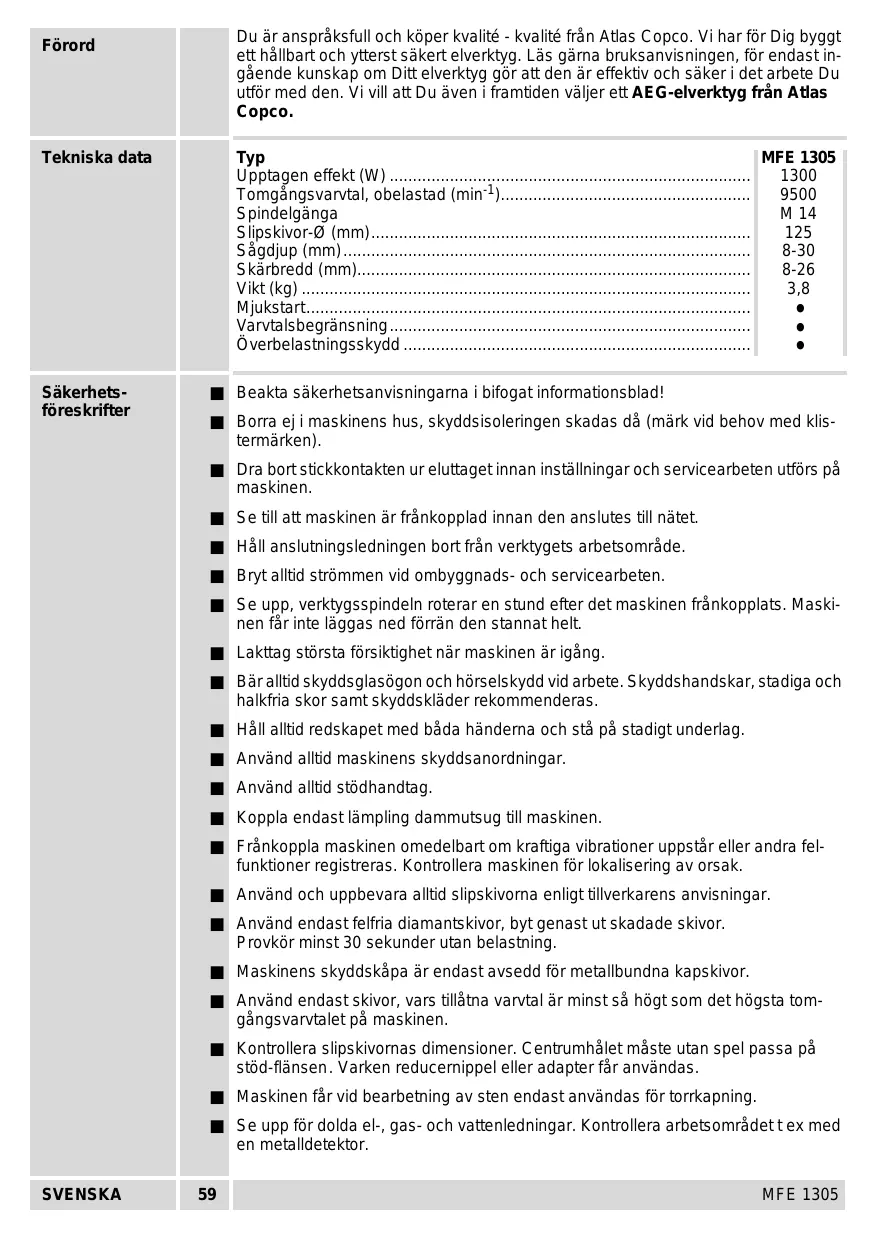 MFE 1305 Du är anspråksfull och köper kvalité - kvalité från Atlas Copco. Vi har för Dig byggt ett hållbart och ytterst säkert elverktyg. Läs gärna bruksanvisningen, för endast ingående kunskap om Ditt elverktyg gör att den är effektiv och säker i det arbete Du utför med den. Vi vill att Du även i framtiden väljer ett AEG-elverktyg från Atlas Copco. Förord Tekniska data Typ MFE 1305 Upptagen effekt (W) .............................................................................. Tomgångsvarvtal, obelastad (min-1)...................................................... Spindelgänga M 14 Slipskivor-Ø (mm).................................................................................. Sågdjup (mm) ........................................................................................ 8-30 Skärbredd (mm)..................................................................................... 8-26 Vikt (kg) ................................................................................................. 3,8 Mjukstart................................................................................................ Varvtalsbegränsning .............................................................................. Överbelastningsskydd ...........................................................................