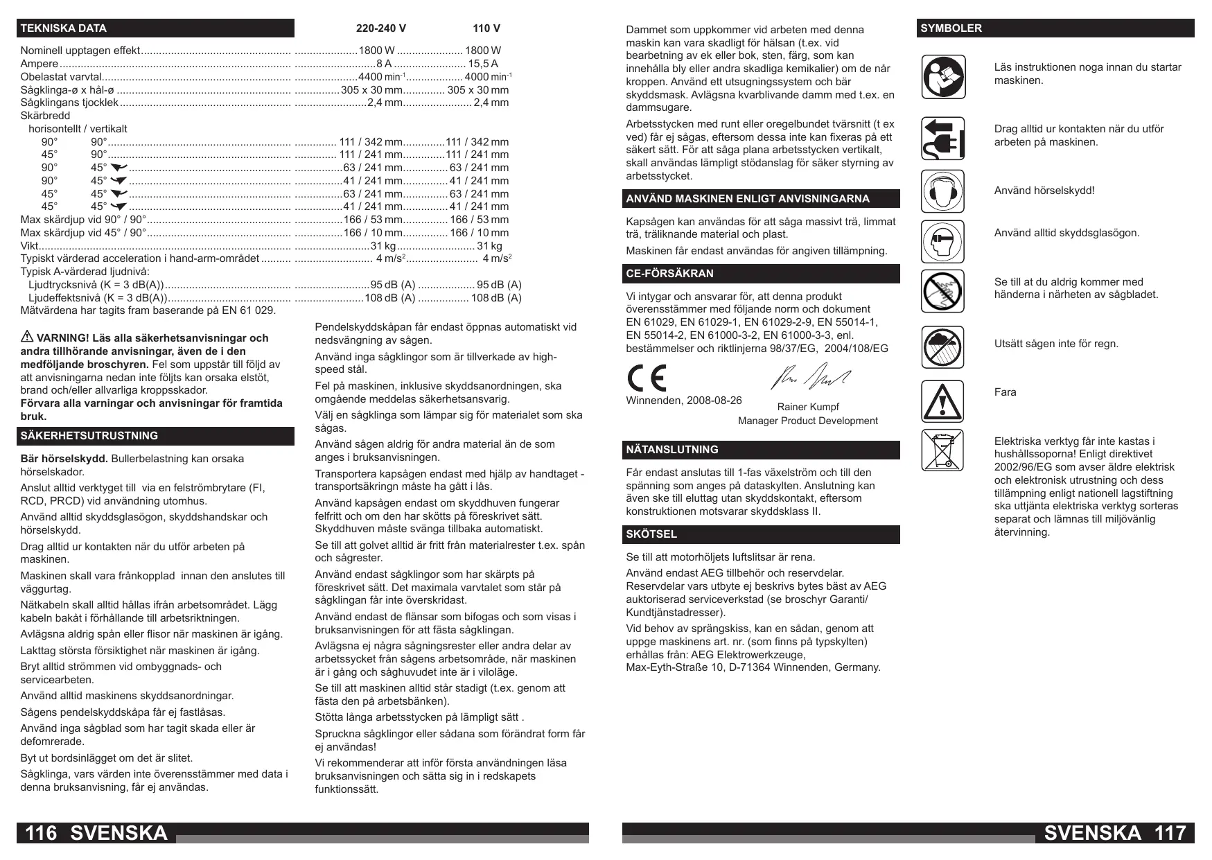 Vi intygar och ansvarar för, att denna produkt överensstämmer med följande norm och dokument EN 61029, EN 61029-1, EN 61029-2-9, EN 55014-1, EN 55014-2, EN 61000-3-2, EN 61000-3-3, enl. bestämmelser och riktlinjerna 98/37/EG, 2004/108/EG Winnenden, 2008-08-26 Använd endast de flänsar som bifogas och som visas i bruksanvisningen för att fästa sågklingan. Avlägsna ej några sågningsrester eller andra delar av arbetssycket från sågens arbetsområde, när maskinen är i gång och såghuvudet inte är i viloläge. Läs instruktionen noga innan du startar maskinen. Drag alltid ur kontakten när du utför arbeten på maskinen. Använd hörselskydd! Använd alltid skyddsglasögon. Se till at du aldrig kommer med händerna i närheten av sågbladet. Utsätt sågen inte för regn. Fara Rainer Kumpf Manager Product Development Får endast anslutas till 1-fas växelström och till den spänning som anges på dataskylten. Anslutning kan även ske till eluttag utan skyddskontakt, eftersom konstruktionen motsvarar skyddsklass II. Maskinen skall vara frånkopplad innan den anslutes till väggurtag. SYMBOLER Maskinen får endast användas för angiven tillämpning. Transportera kapsågen endast med hjälp av handtaget transportsäkringn måste ha gått i lås. Se till att golvet alltid är fritt från materialrester t.ex. spån och sågrester. Bryt alltid strömmen vid ombyggnads- och servicearbeten. Kapsågen kan användas för att såga massivt trä, limmat trä, träliknande material och plast. NÄTANSLUTNING Drag alltid ur kontakten när du utför arbeten på maskinen. Lakttag största försiktighet när maskinen är igång.