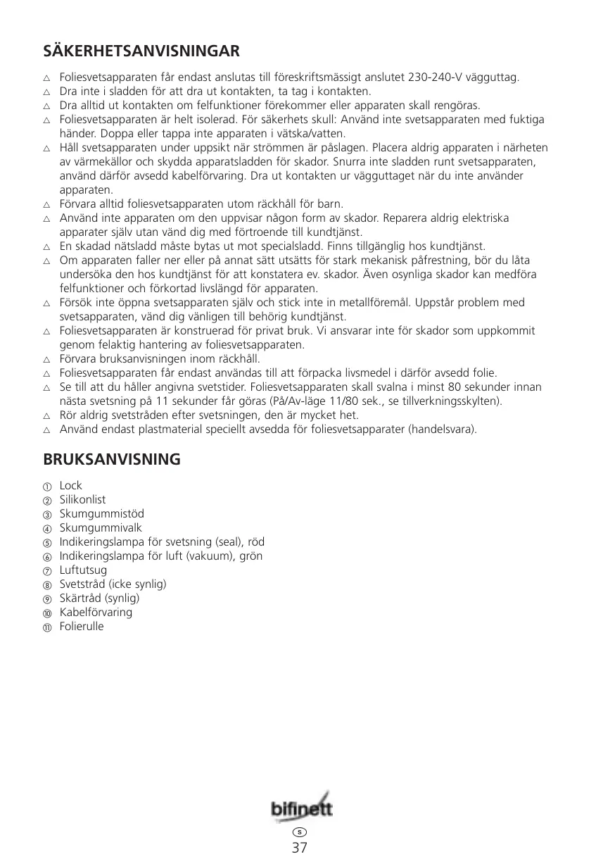 SÄKERHETSANVISNINGAR Foliesvetsapparaten får endast anslutas till föreskriftsmässigt anslutet 230-240-V vägguttag. Dra inte i sladden för att dra ut kontakten, ta tag i kontakten. Dra alltid ut kontakten om felfunktioner förekommer eller apparaten skall rengöras. Foliesvetsapparaten är helt isolerad. För säkerhets skull: Använd inte svetsapparaten med fuktiga händer. Doppa eller tappa inte apparaten i vätska/vatten. Håll svetsapparaten under uppsikt när strömmen är påslagen. Placera aldrig apparaten i närheten av värmekällor och skydda apparatsladden för skador. Snurra inte sladden runt svetsapparaten, använd därför avsedd kabelförvaring. Dra ut kontakten ur vägguttaget när du inte använder apparaten. Förvara alltid foliesvetsapparaten utom räckhåll för barn. Använd inte apparaten om den uppvisar någon form av skador. Reparera aldrig elektriska apparater själv utan vänd dig med förtroende till kundtjänst. En skadad nätsladd måste bytas ut mot specialsladd. Finns tillgänglig hos kundtjänst. Om apparaten faller ner eller på annat sätt utsätts för stark mekanisk påfrestning, bör du låta undersöka den hos kundtjänst för att konstatera ev. skador. Även osynliga skador kan medföra felfunktioner och förkortad livslängd för apparaten. Försök inte öppna svetsapparaten själv och stick inte in metallföremål. Uppstår problem med svetsapparaten, vänd dig vänligen till behörig kundtjänst. Foliesvetsapparaten är konstruerad för privat bruk. Vi ansvarar inte för skador som uppkommit genom felaktig hantering av foliesvetsapparaten. Förvara bruksanvisningen inom räckhåll. Foliesvetsapparaten får endast användas till att förpacka livsmedel i därför avsedd folie. Se till att du håller angivna svetstider. Foliesvetsapparaten skall svalna i minst 80 sekunder innan nästa svetsning på 11 sekunder får göras (På/Av-läge 11/80 sek., se tillverkningsskylten). Rör aldrig svetstråden efter svetsningen, den är mycket het. Använd endast plastmaterial speciellt avsedda för foliesvetsapparater (handelsvara).