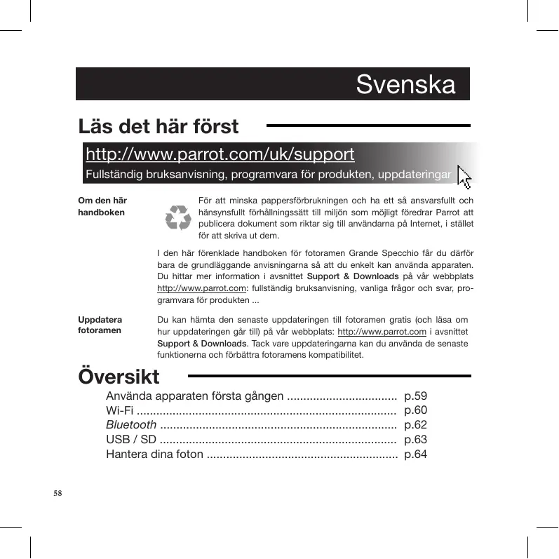1 den här fürenkiade handboken für fotoramen Grande Specchio fär du därièr bara de grundläggande anvisningamna sä att du enkeit kan använda apparaten Du hittar mer information 1 avsnittet Support & Downloads pà vr webbplats bttp:/Awparrot com fulstänaig bruksanvisning, vanliga frâgor och svar, pro gramvara fbr produkten