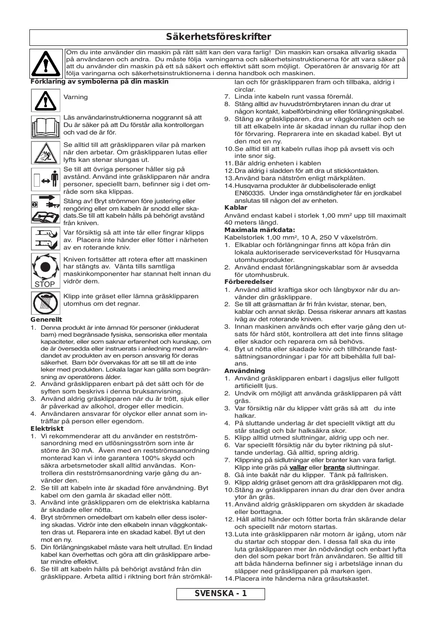12.Dra aldrig i sladden för att dra ut stickkontakten. 13.Använd bara nätström enligt märkplåten. 14.Husqvarna produkter är dubbelisolerade enligt EN60335. Under inga omständigheter får en jordkabel anslutas till någon del av enheten. Kablar Använd endast kabel i storlek 1,00 mm2 upp till maximalt 40 meters längd. Maximala märkdata: Kabelstorlek 1,00 mm2, 10 A, 250 V växelström.