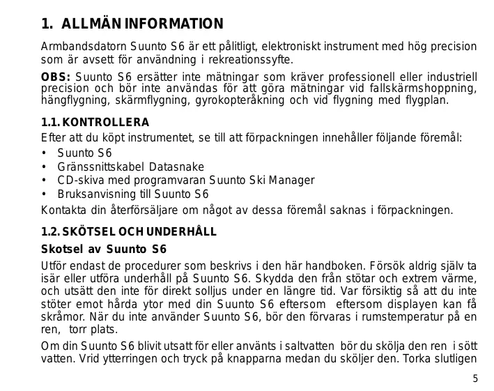 Armbandsdatorn Suunto S6 är ett pålitligt, elektroniskt instrument med hög precision som är avsett för användning i rekreationssyfte. OBS: Suunto S6 ersätter inte mätningar som kräver professionell eller industriell precision och bör inte användas för att göra mätningar vid fallskärmshoppning, hängflygning, skärmflygning, gyrokopteråkning och vid flygning med flygplan. 1.1. KONTROLLERA Efter att du köpt instrumentet, se till att förpackningen innehåller följande föremål:
